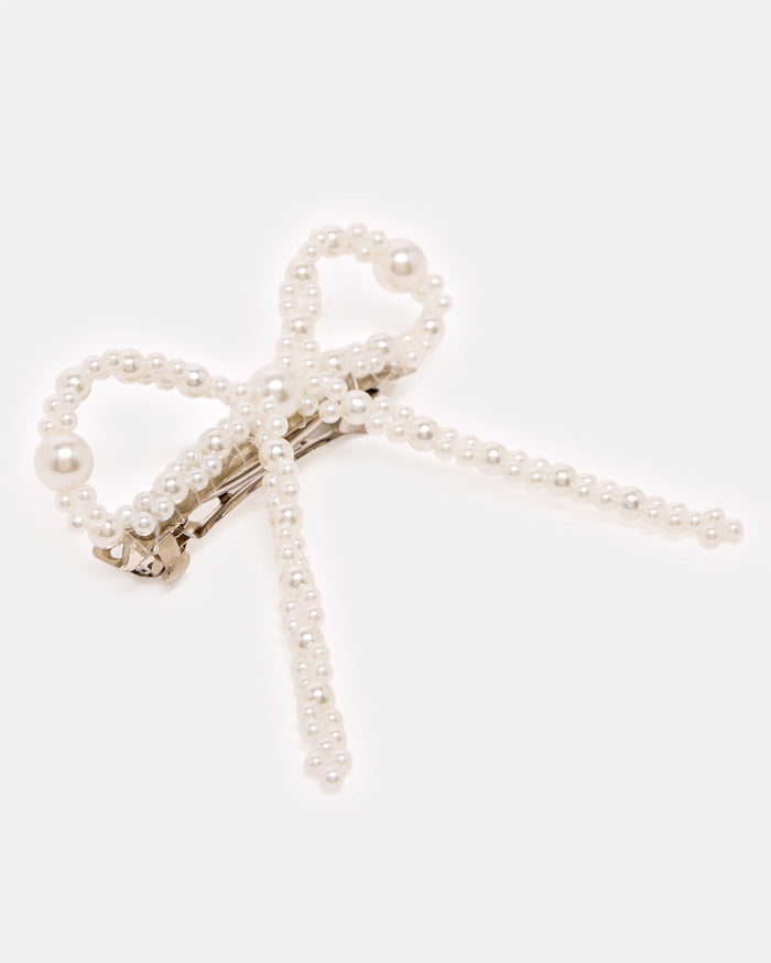 مشبك شعر أنيق بتصميم فيونكة مزينة باللؤلؤ يضفي لمسة راقية على تسريحتها.