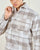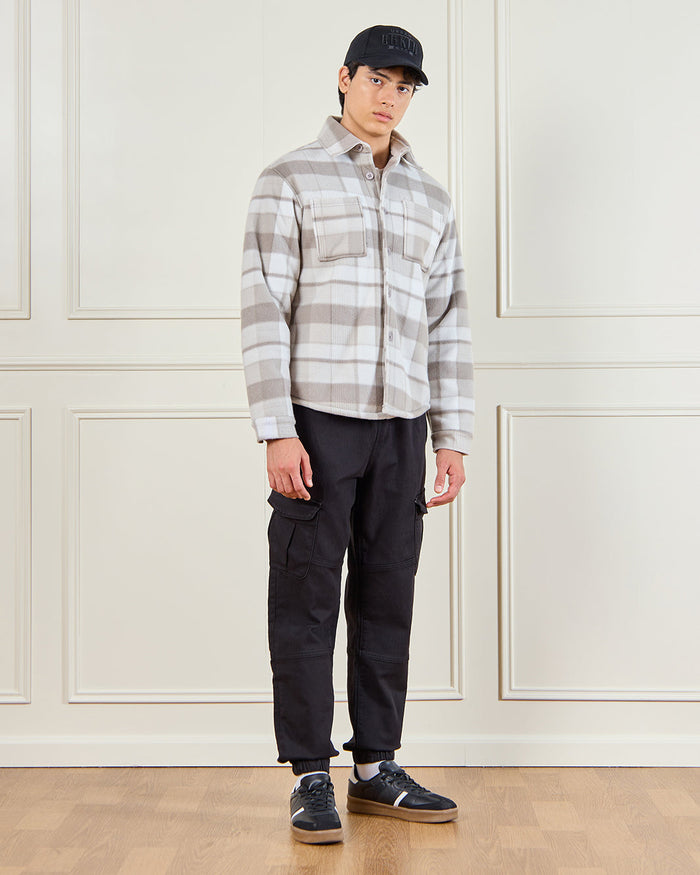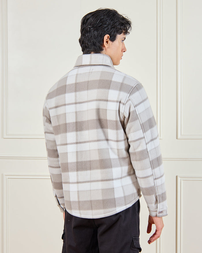 جاكيت قميص بنقشة مربعات باللون البيج يجمع بين الأناقة والدفء. يتميز بجيوب أمامية وتصميم مريح، مثالي للارتداء في الأجواء الباردة