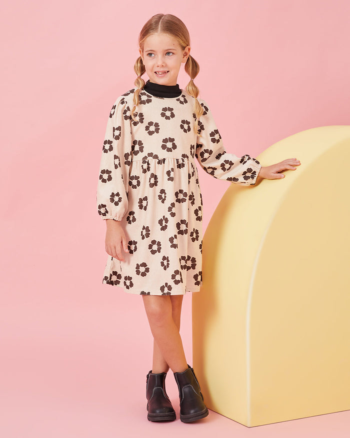فستان بلون بيج مزين بنقشات زهور بارزة يمنح البنات مظهراً مرحاً وعصرياً. يتميز بأكمام طويلة وقصة مريحة ليجمع بين الأناقة والراحة طوال اليوم.