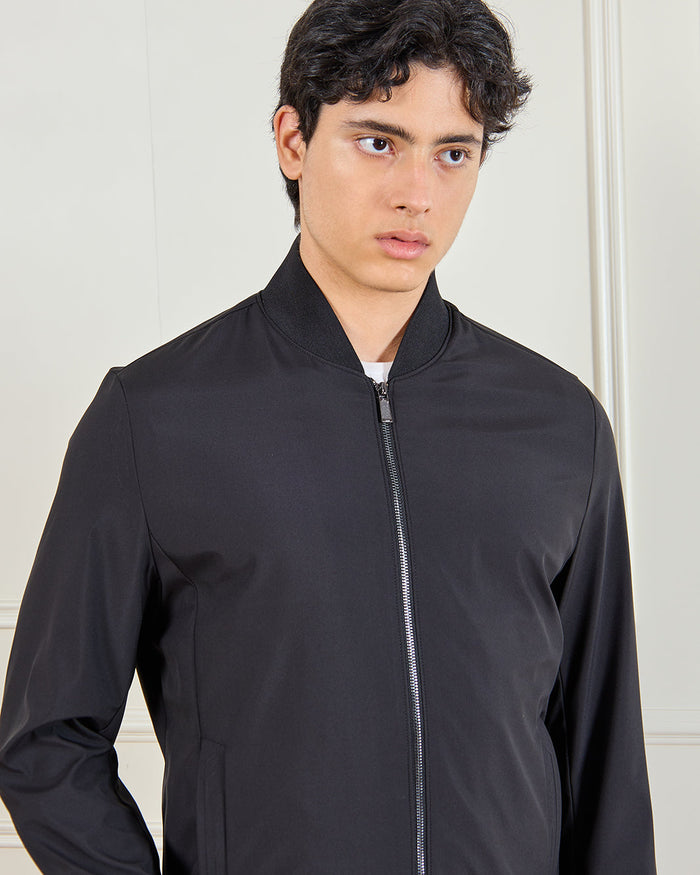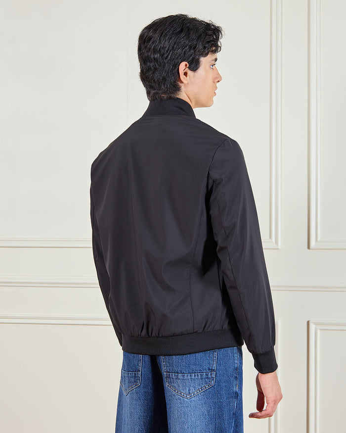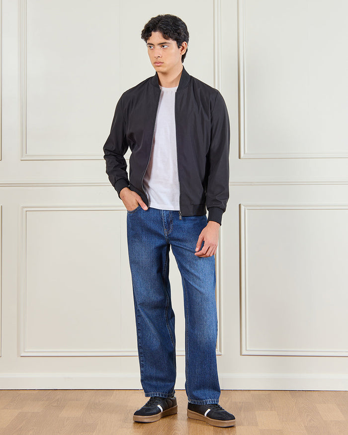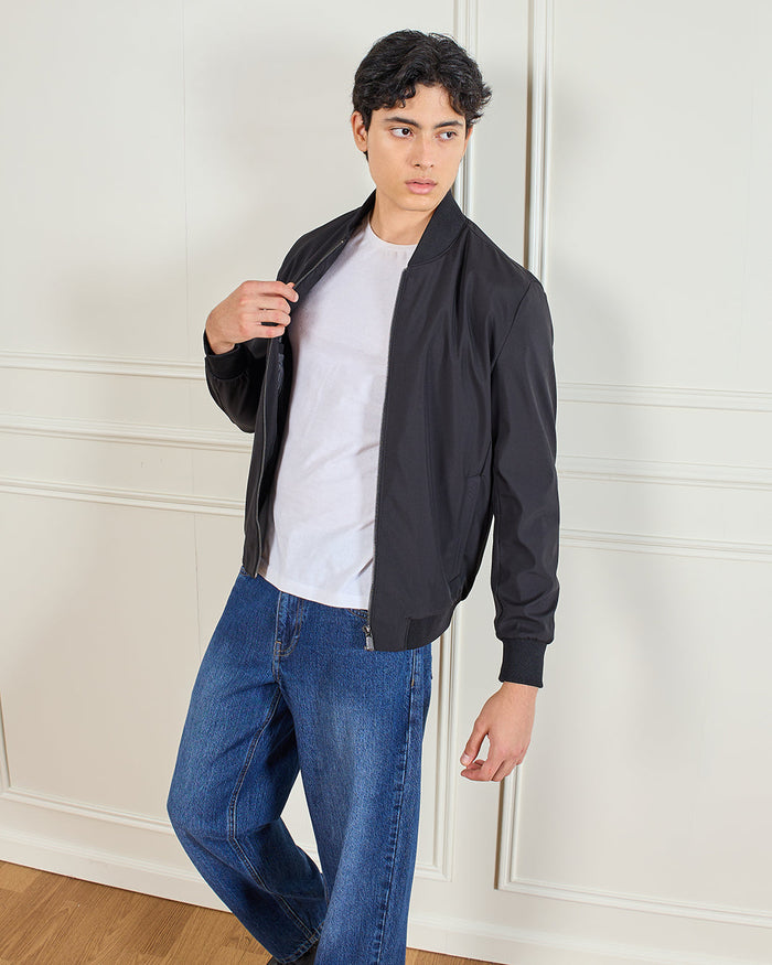 احصل على إطلالة عصرية مع جاكيت بومبر باللون الأسود. يتميز بسحّاب أمامي وأطراف مطاطية، ويتناسق بشكل مثالي مع الجينز لمظهر عصري جذاب