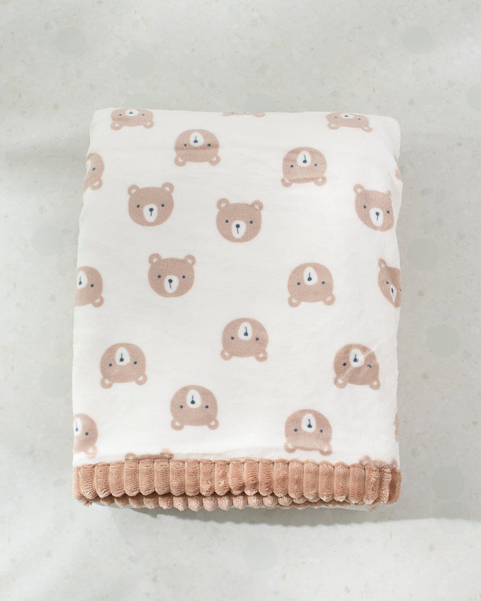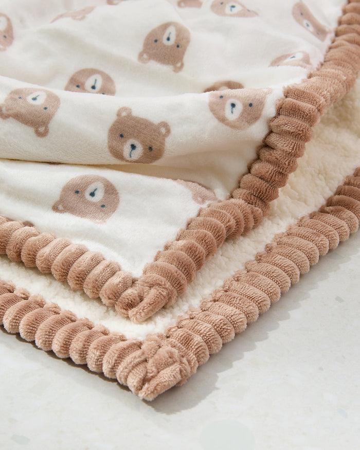 بطانية أطفال ناعمة ومزخرفة بلون بني، مصممة بطبقتين لتوفير الدفء. تأتي بجزء أمامي من فانيلا بوليستر بوزن 260gsm وخلفي من شيربا بوليستر بوزن 240gsm، مما يمنح طفلك راحة فائقة. الإطار الجانبي المصنوع من فانيلا مخططة يضفي لمسة أنيقة. مناسبة للأطفال حتى عمر 12 شهرًا.