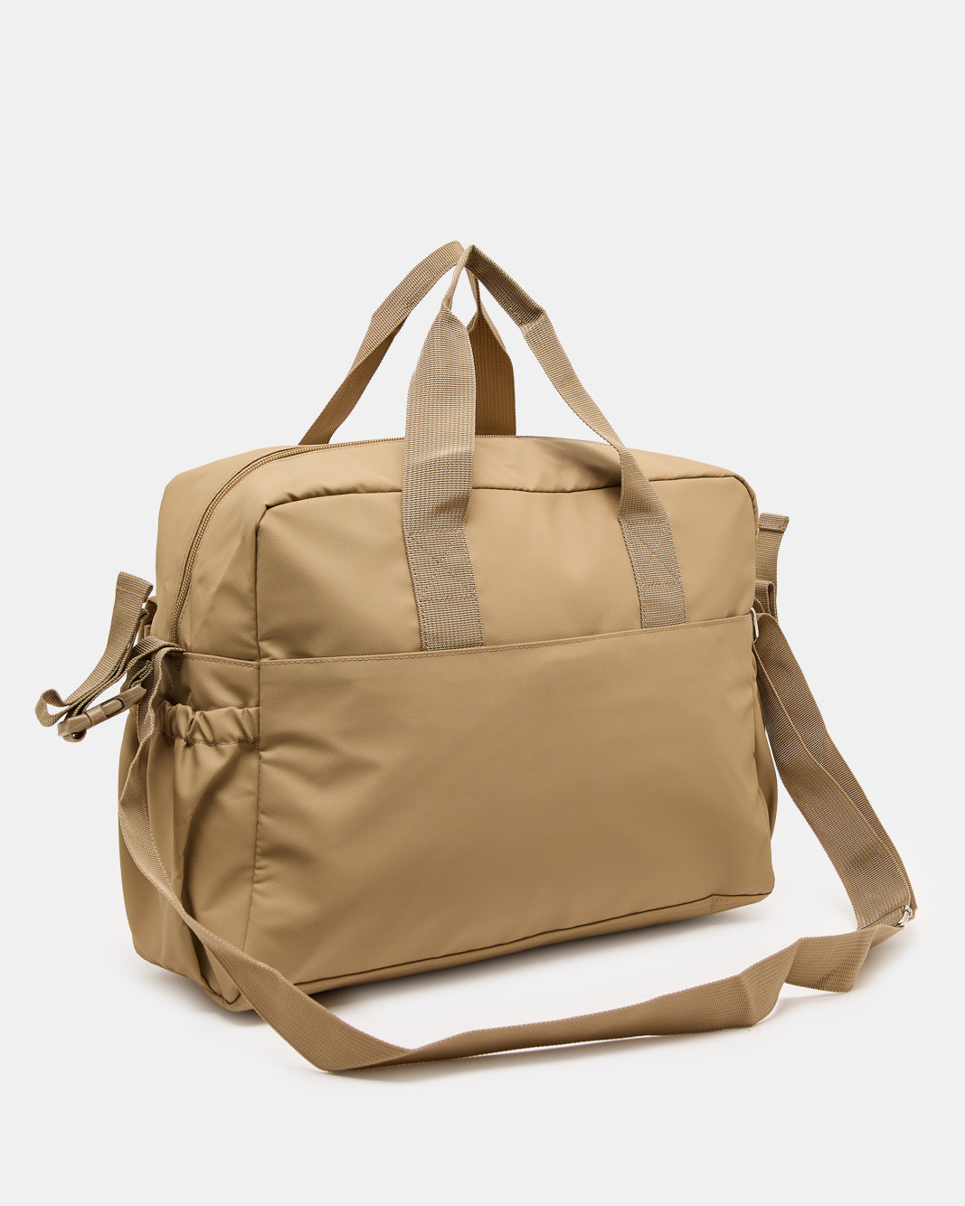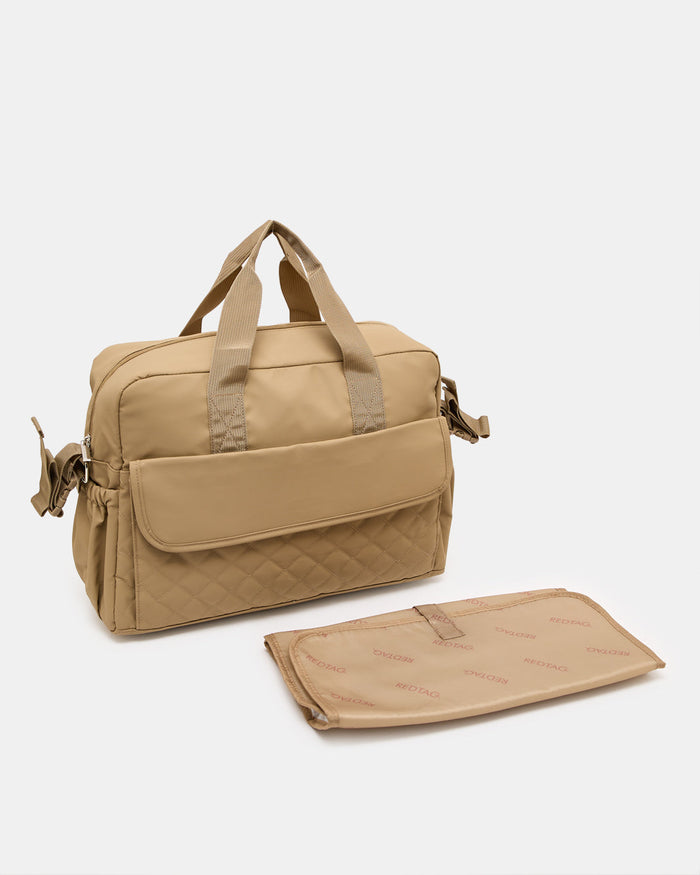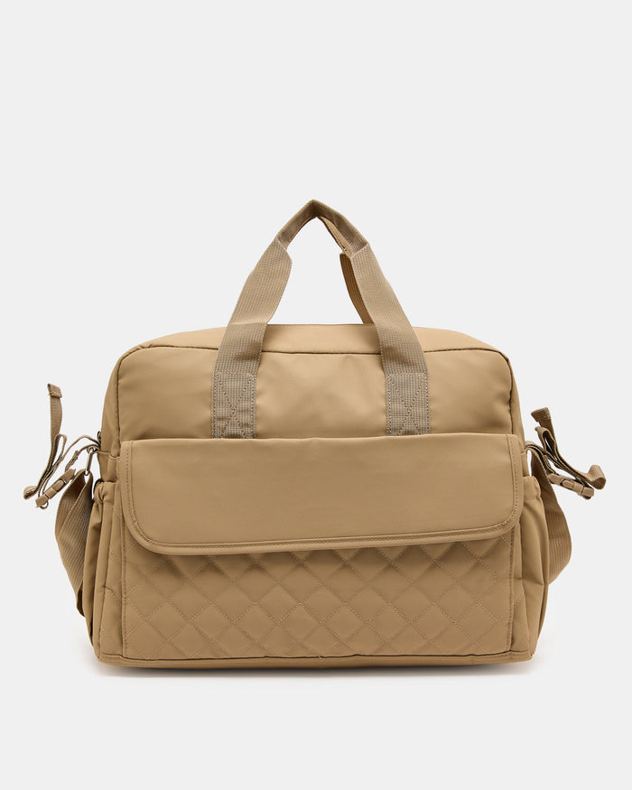 حافظي على تنظيم أغراض طفلك أثناء التنقل مع هذه الحقيبة الواسعة باللون البيج. تتميز بعدة جيوب لتخزين المستلزمات وجيوب جانبية للزجاجات وسجادة تغيير قابلة للطي، مما يجعلها مثالية للوالدين دائمَي الحركة. تصميمها المبطّن يضيف لمسة أناقة، مع مقابض متينة وحزام قابل للتعديل لراحة أكبر.