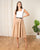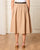 تنورة أنيقة بقصة A وتفاصيل كسرات ناعمة مع حزام يحدد الخصر، مثالية للعمل أو الإطلالات اليومية الراقية.
