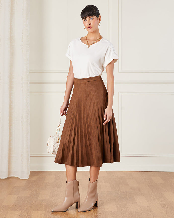تنورة متوسطة الطول بكسرات أنيقة تمنحك إطلالة انسيابية وخالدة. مثالية للتنسيق مع القمصان أو البلوزات أو التيشيرتات لإطلالات متنوعة من النهار إلى الليل.