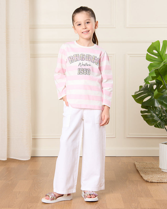 تيشيرت مخطط باللون العاجي والوردي للبنات الصغار