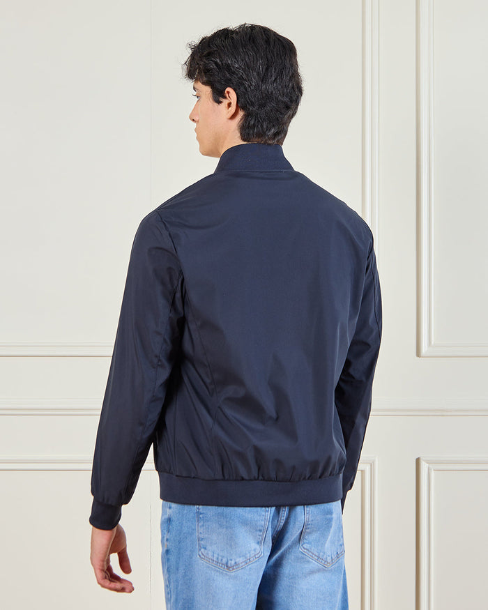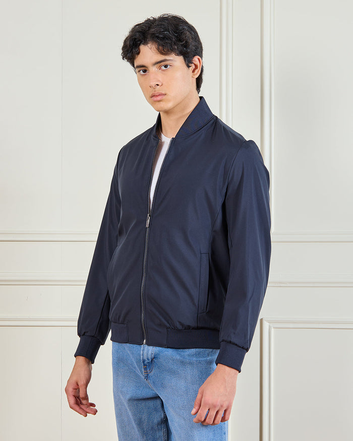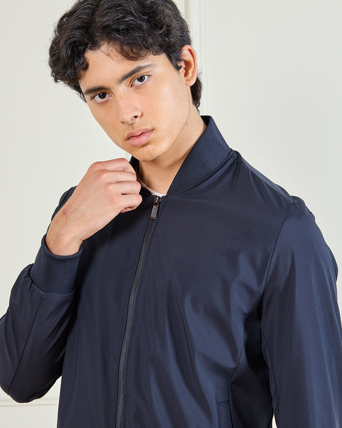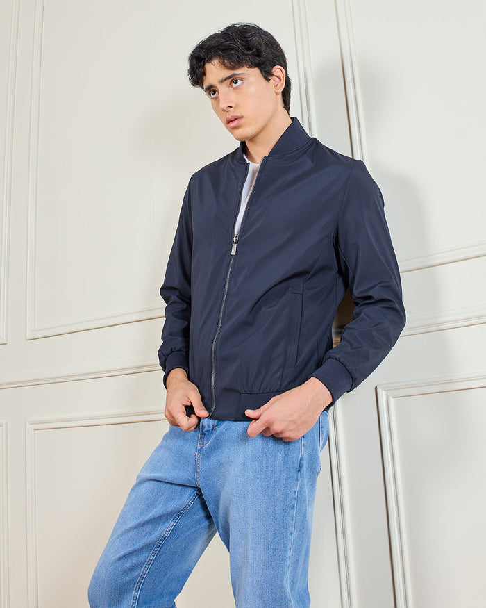جاكيت بومبر باللون الكحلي، قطعة أساسية لكل رجل عصري. يتميز بأطراف مطاطية وسحّاب أمامي، مثالي للارتداء فوق التيشيرت أو القميص.
