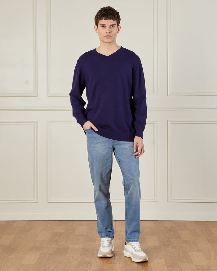 سويتر رجالي محبوك بياقة على شكل V بلون كحلي – بأكمام طويلة