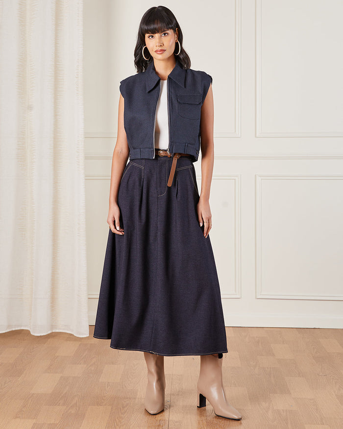 اختاري لمسة من الأناقة العصرية مع هذه التنورة الميدي المنسوجة بلون كحلي، المصممة بقصة واسعة أنثوية وحزام قابل للإزالة لتحديد الخصر. مثالية للإطلالات الكاجوال الأنيقة أو لإطلالات العمل العصرية.