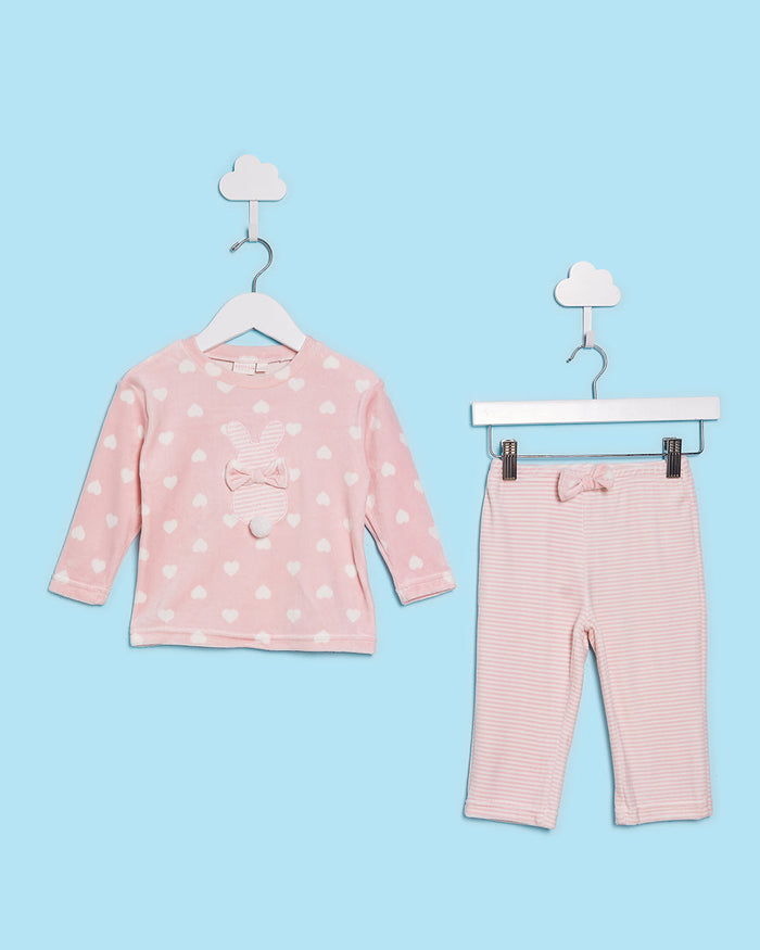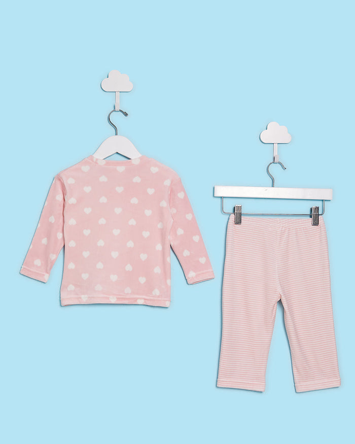 A cozy pink velour pyjama set designed for comfort and cuteness, featuring an all-over heart-like print. Perfect for keeping your little one snug through the night.