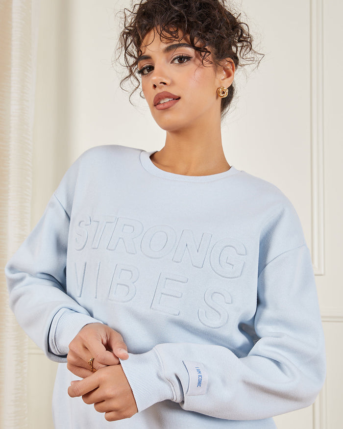 Stay cosy and stylish in this light blue sweatshirt featuring an embossed "Strong Vibes" slogan. Designed for everyday comfort, it offers a soft interior and a relaxed silhouette perfect for casual layering. Pair it with jeans or joggers for an effortlessly cool look.