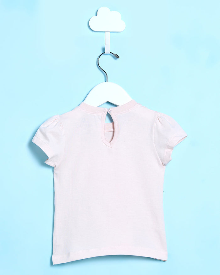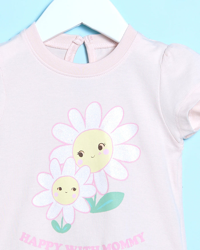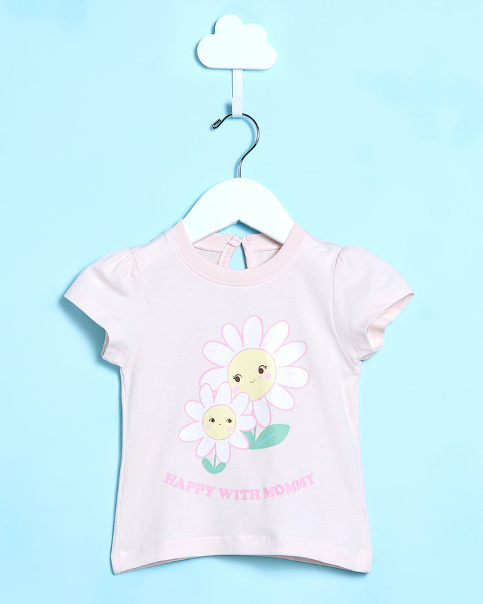A light pink T-shirt adorned with smiling flower prints and the words “Happy With Mommy”, a lovely pick for cuddly days.