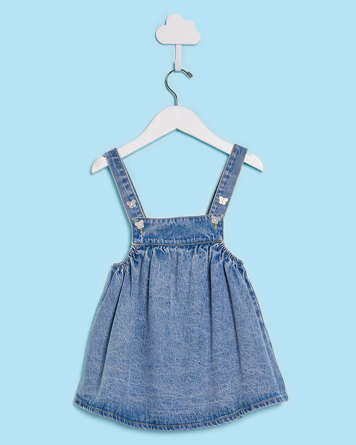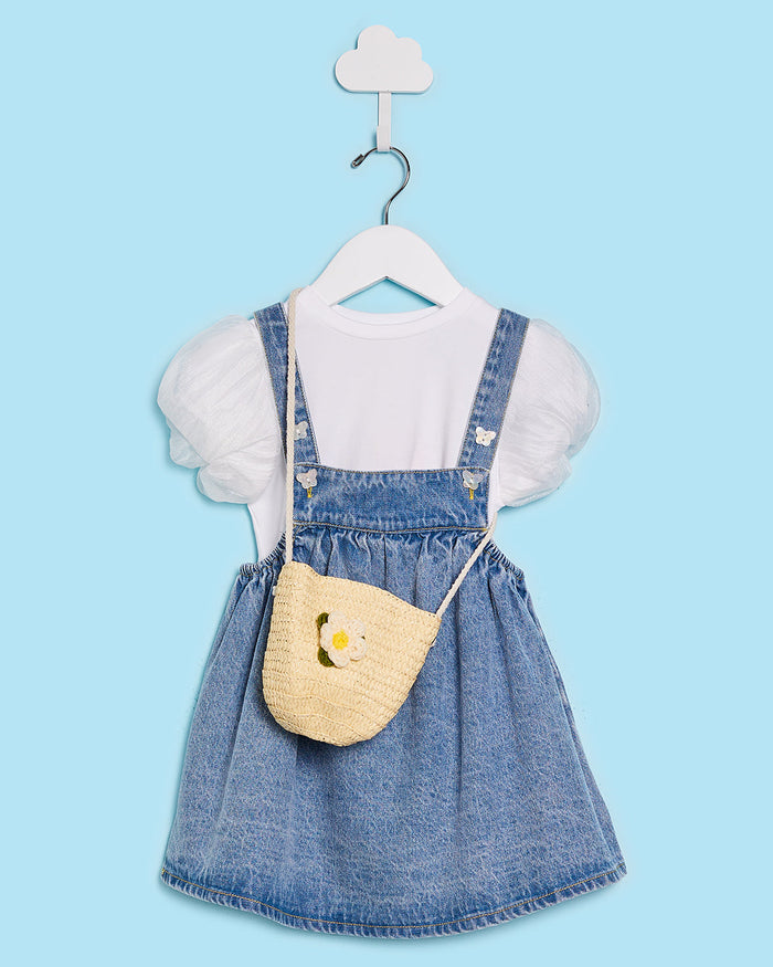 Keep her cute and comfy in this charming 2-piece outfit. The soft white rib-knit top features long sleeves for cozy layering, while the light blue denim dress adds a classic touch. Perfect for everyday wear or casual outings.