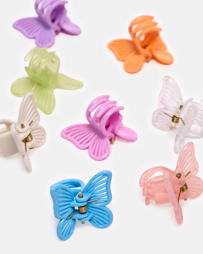 A colourful butterfly clip set that brightens up any hairstyle. Lightweight and easy to use, perfect for playful looks.
