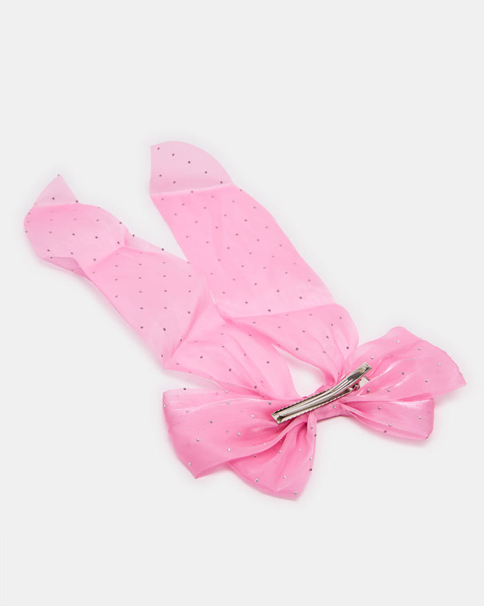 This sheer pink bow hairpiece adds a sweet and elegant touch to her hairstyle, perfect for parties or dressing up.