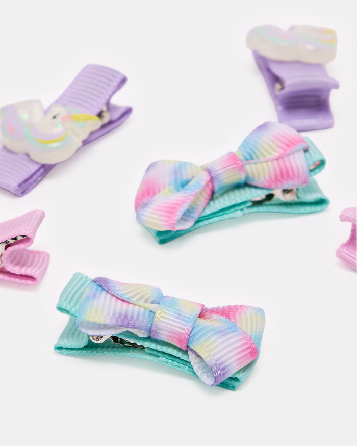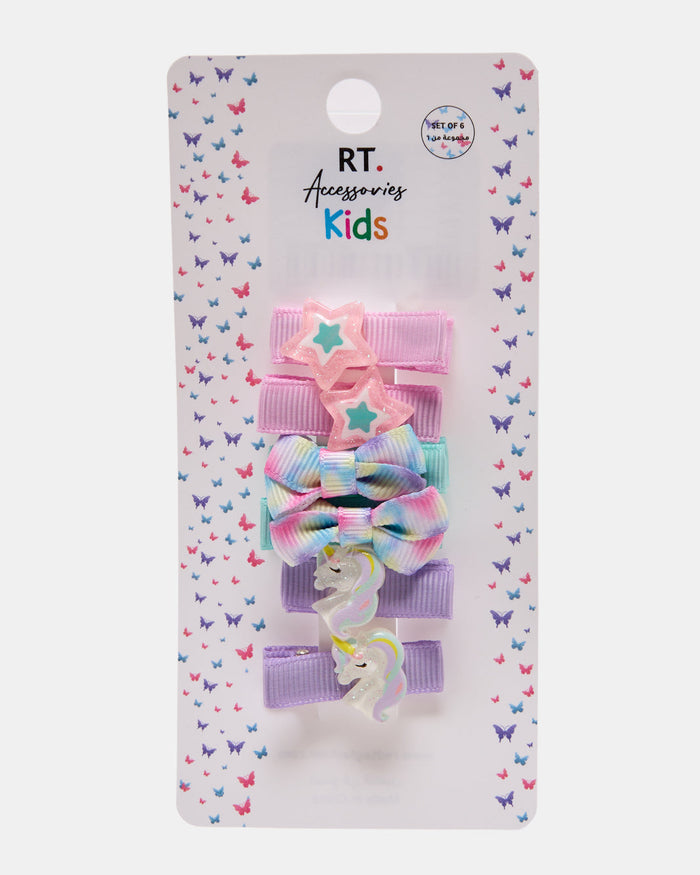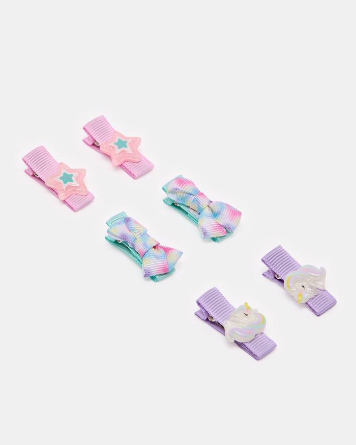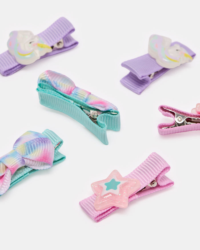 Add a magical touch to her hairstyle with this adorable 6-piece clip set featuring pastel stars, bows, and unicorns. Designed for a gentle hold that stays in place all day, perfect for school or playtime.