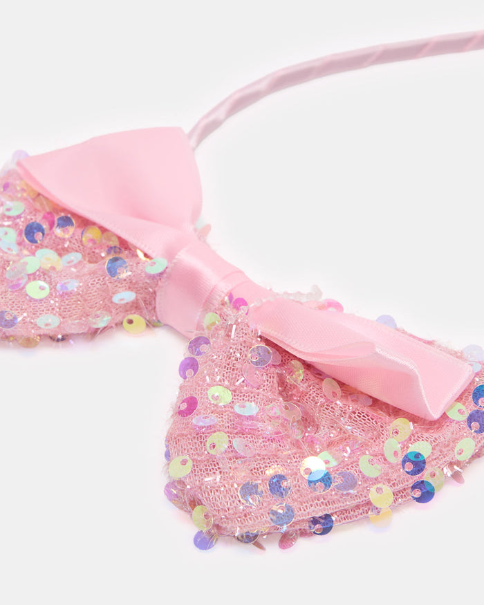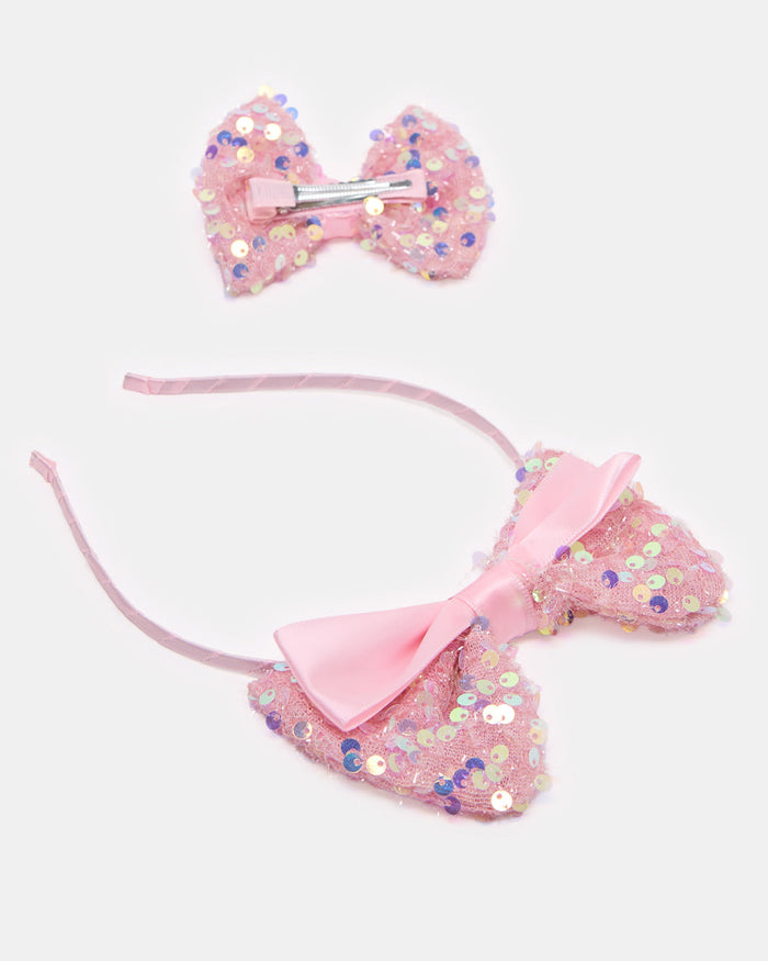 This matching set features a sparkling sequined bow headband and a clip for coordinated style. The soft band ensures comfort, while the glitter adds fun to her outfit.