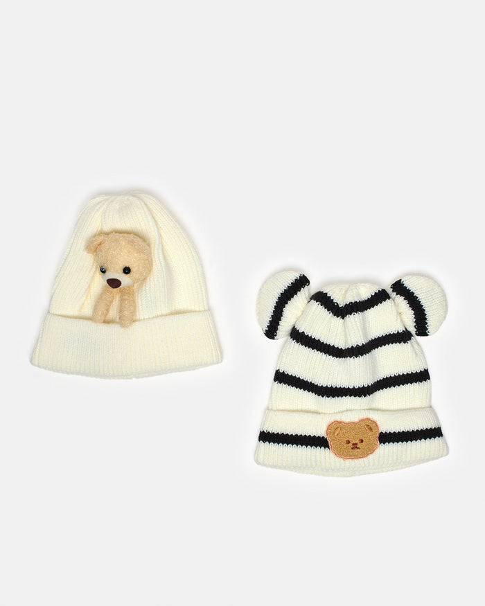 Boys Beige Bear Print Knitted Caps Set (Pack Of 2)