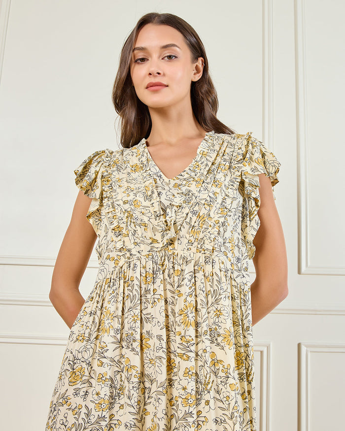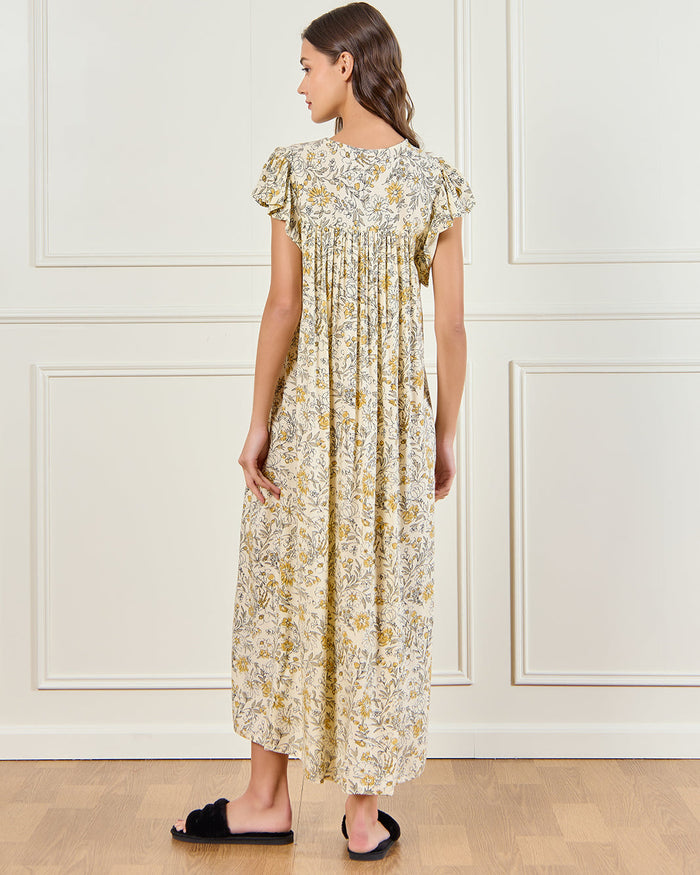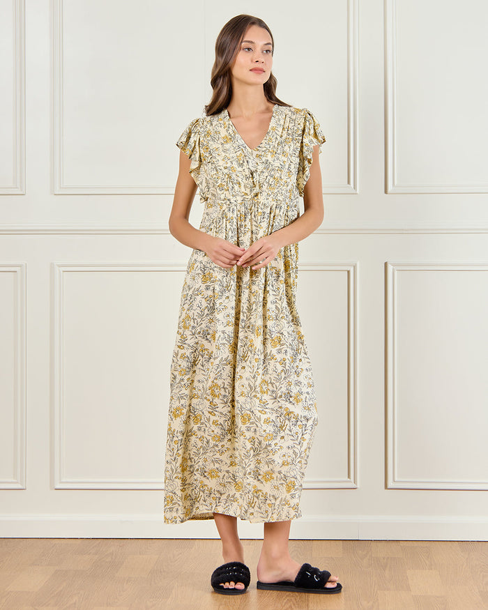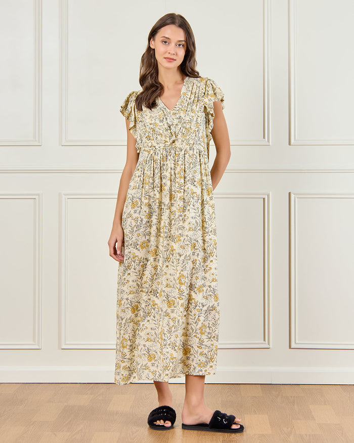 Drift into comfort with this floral yellow nightgown, designed with delicate ruffled sleeves and a relaxed fit. The airy fabric lets you move freely and sleep soundly through the night.