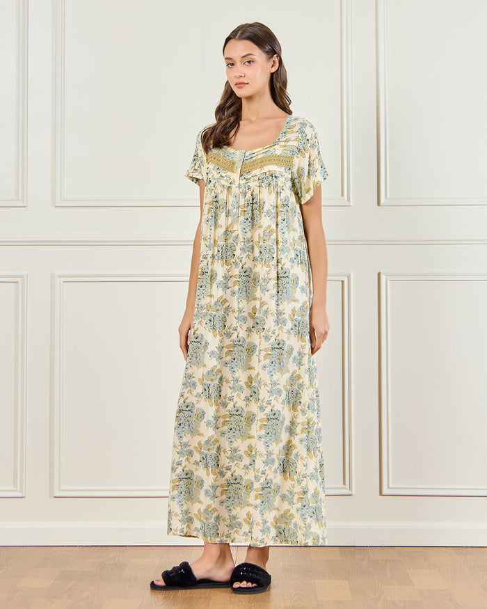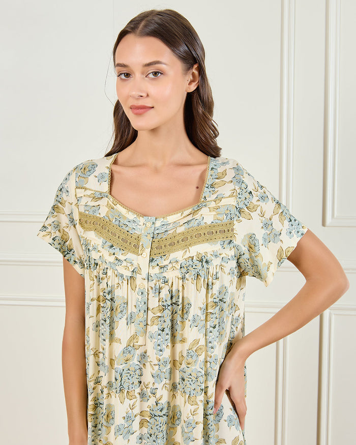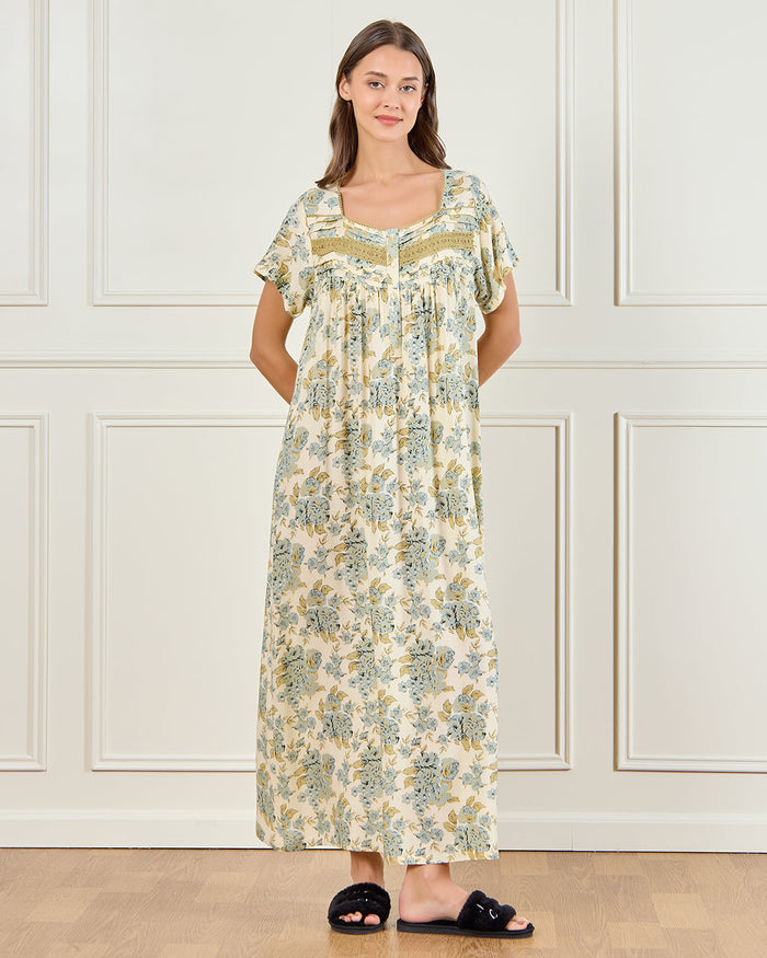 A feminine nightgown with lace trim and a tie-front detail for added elegance. Light and breathable fabric ensures a restful night’s sleep and easy lounging at home.