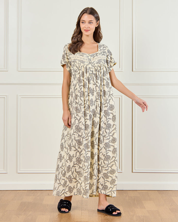Relax in style with this beige floral nightgown. Its loose cut and soft texture make it the perfect choice for unwinding after a long day or enjoying a calm morning.