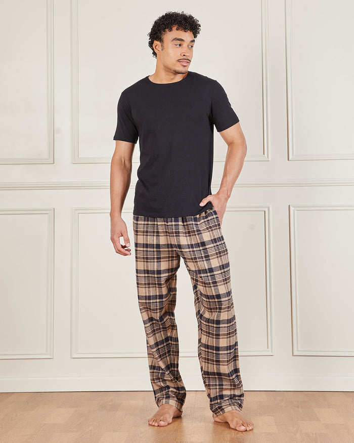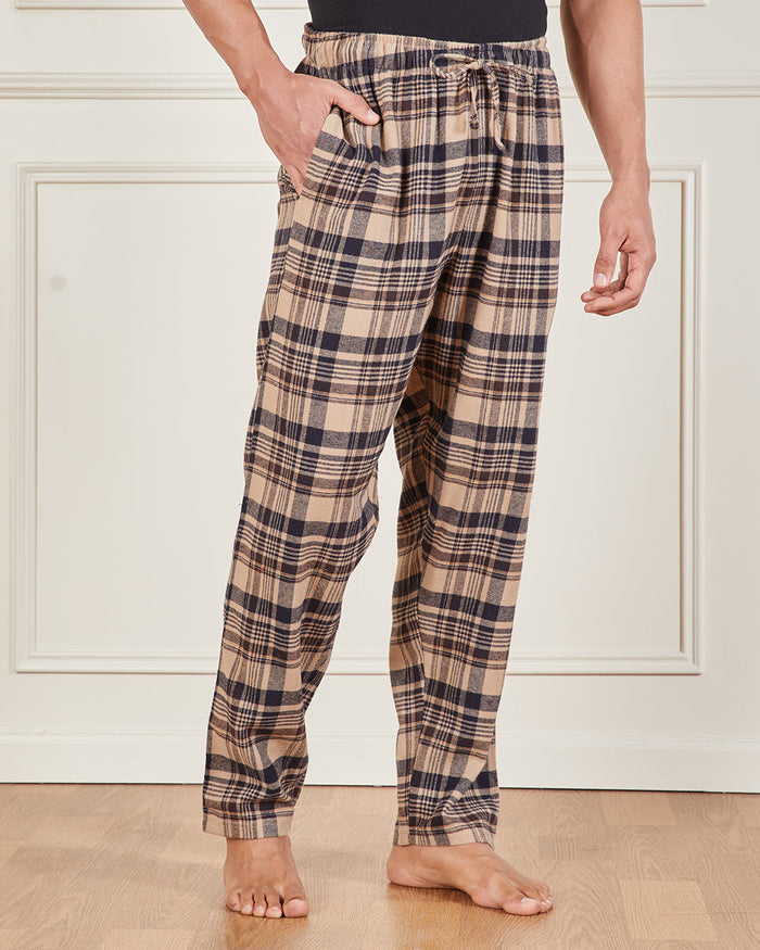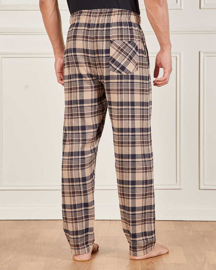 These men's pyjama pants feature a timeless beige and navy checkered pattern. Designed with a drawstring waist and soft fabric for maximum comfort, perfect for lounging or bedtime.