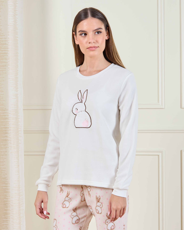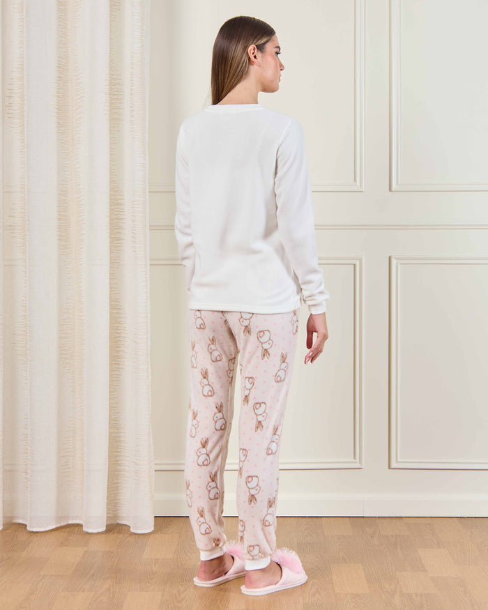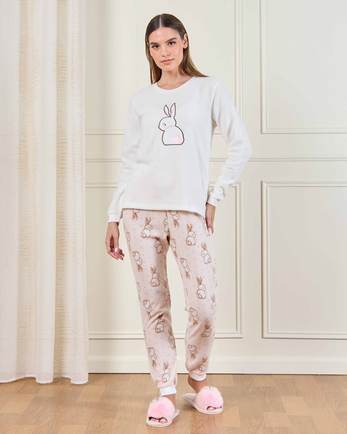 Women White And Cream Rabbit Print Pyjama Set (2 Piece)