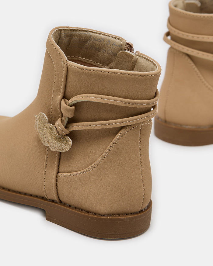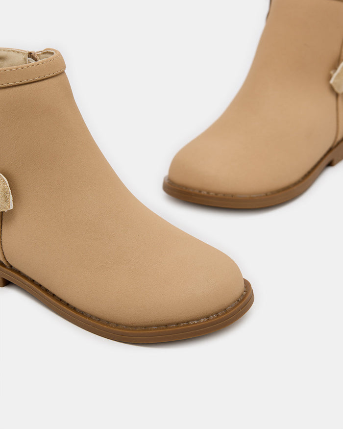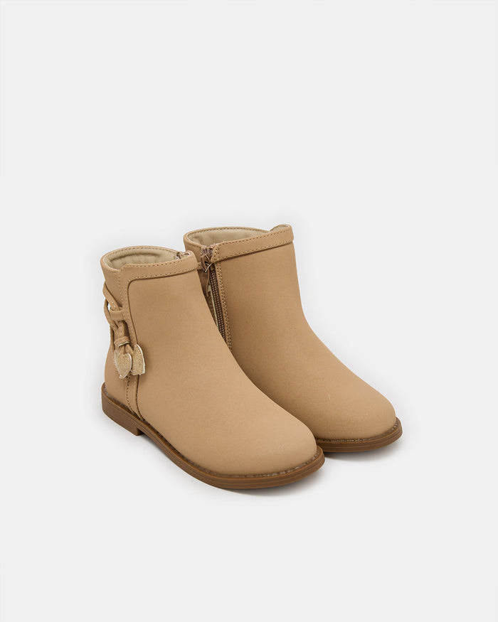 Chic beige ankle boots designed with double strap accents and a sparkly bow detail, perfect for adding a touch of charm to her outfits.