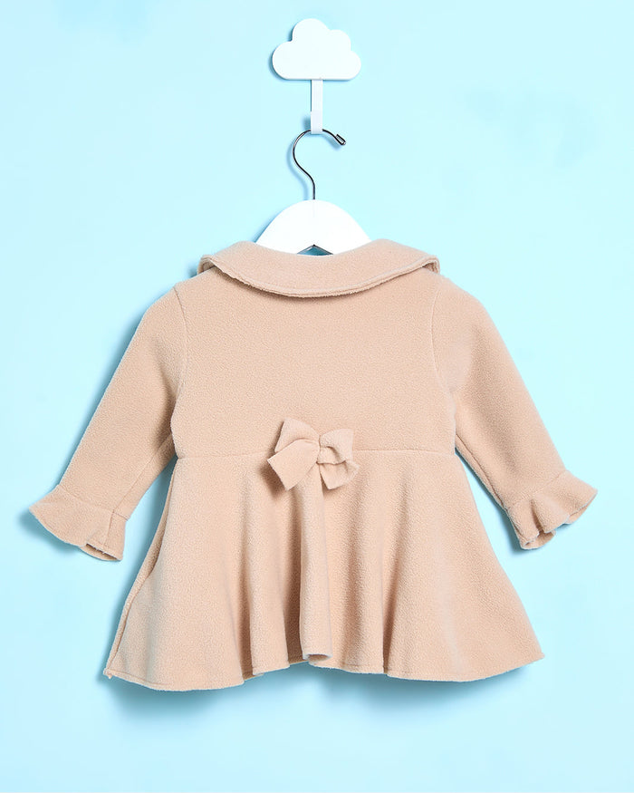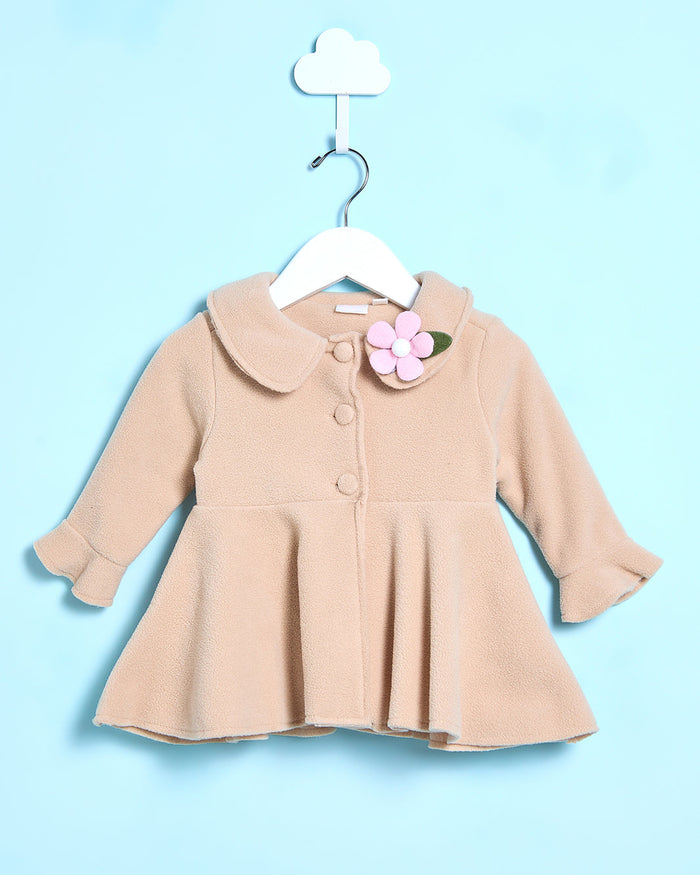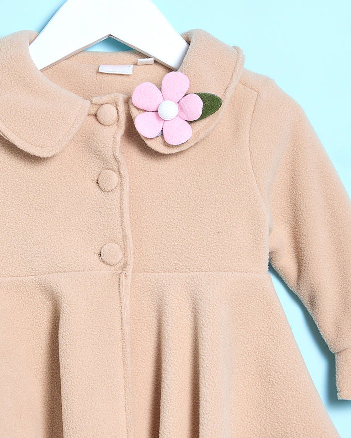A charming flared coat featuring a Peter Pan collar and flower detail, perfect for dressing her up in timeless style this season.