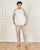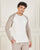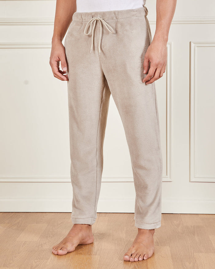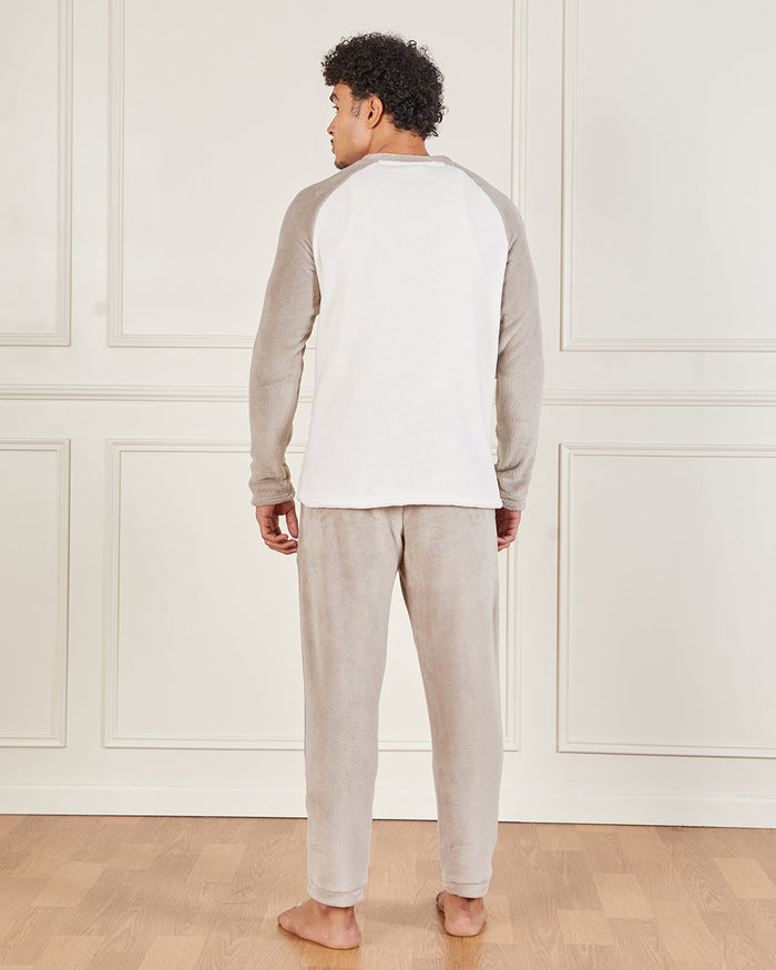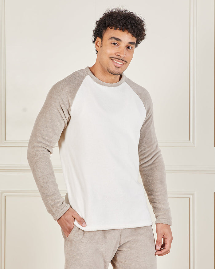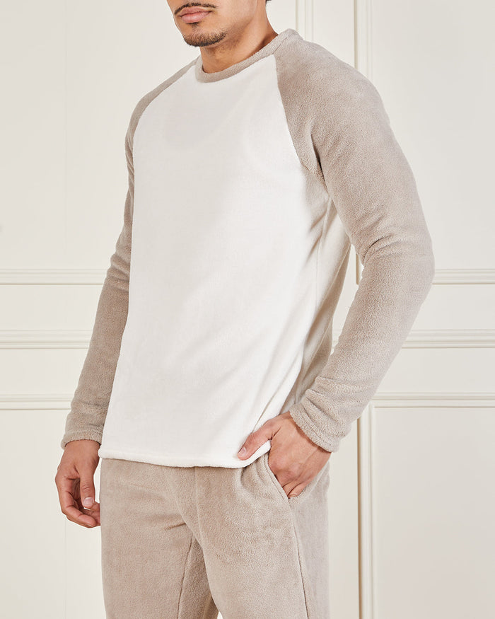 A modern two-tone pyjama set for men in beige and white. Featuring a crew-neck top with contrasting sleeves and matching pants, this item combines comfort with simple elegance.