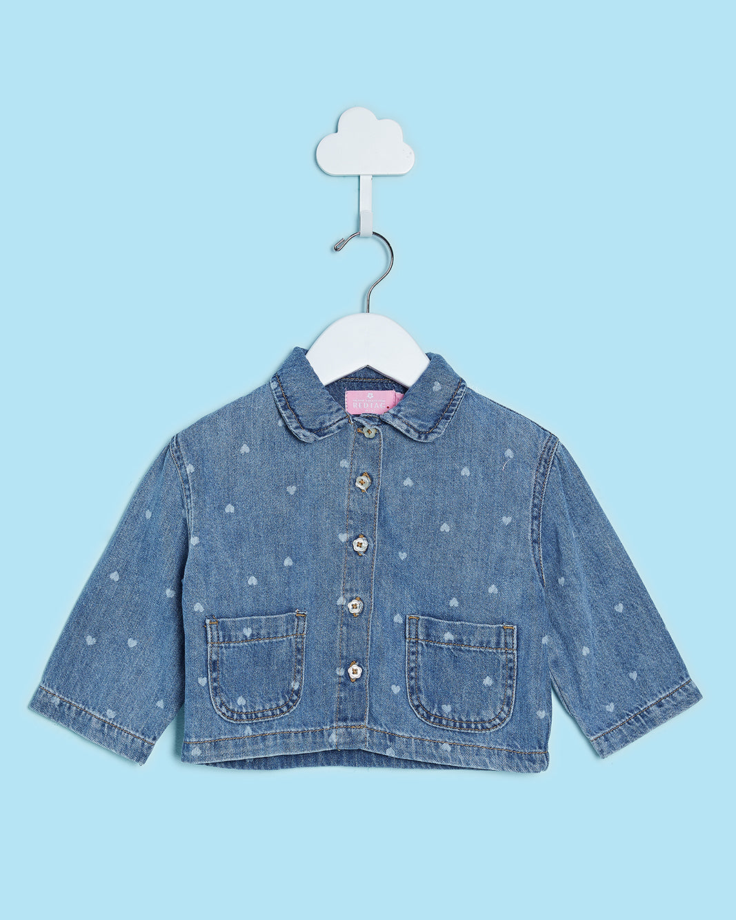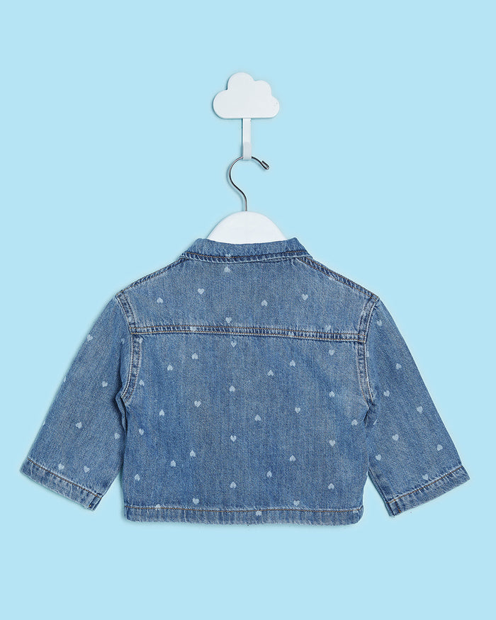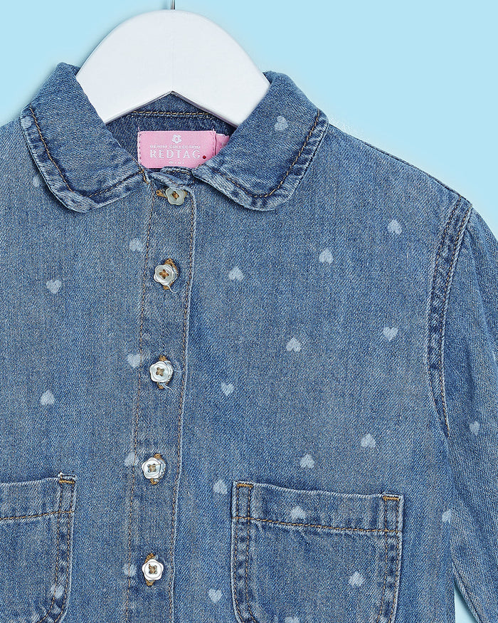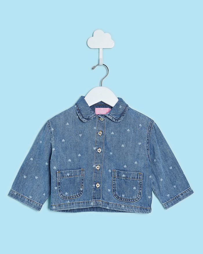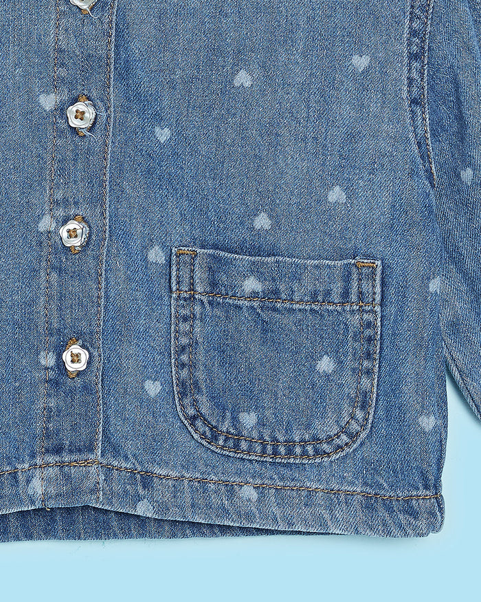 Infant Girls Blue Front Button Denim Blouse Heart All Over Print
