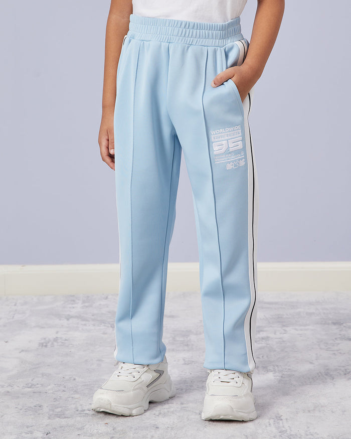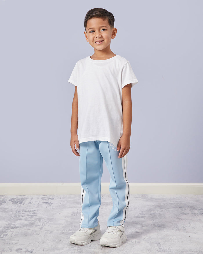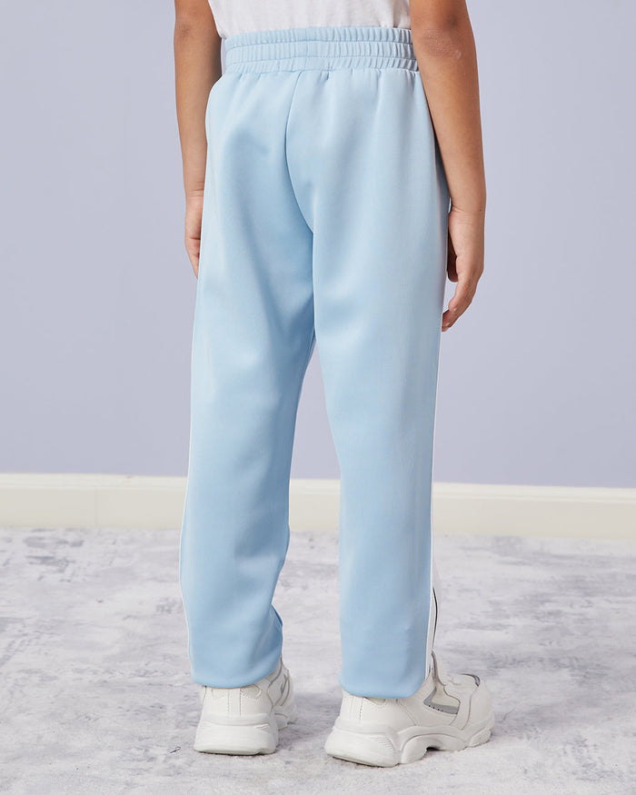 Keep him active and comfortable in these light blue track pants. Designed with contrast side stripes, elastic waistband, and sporty print detail for a cool athletic look, perfect for school or playtime.