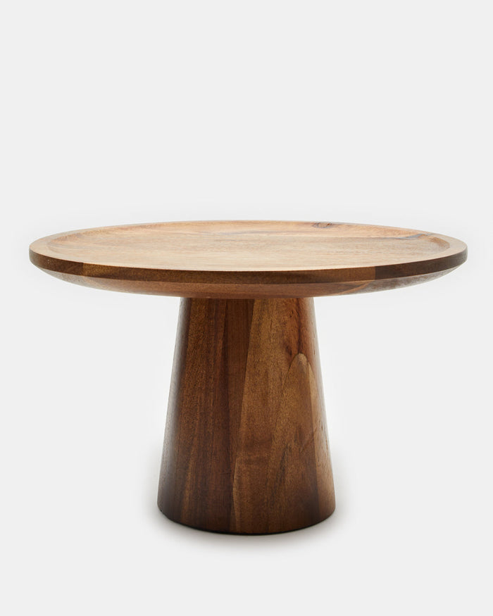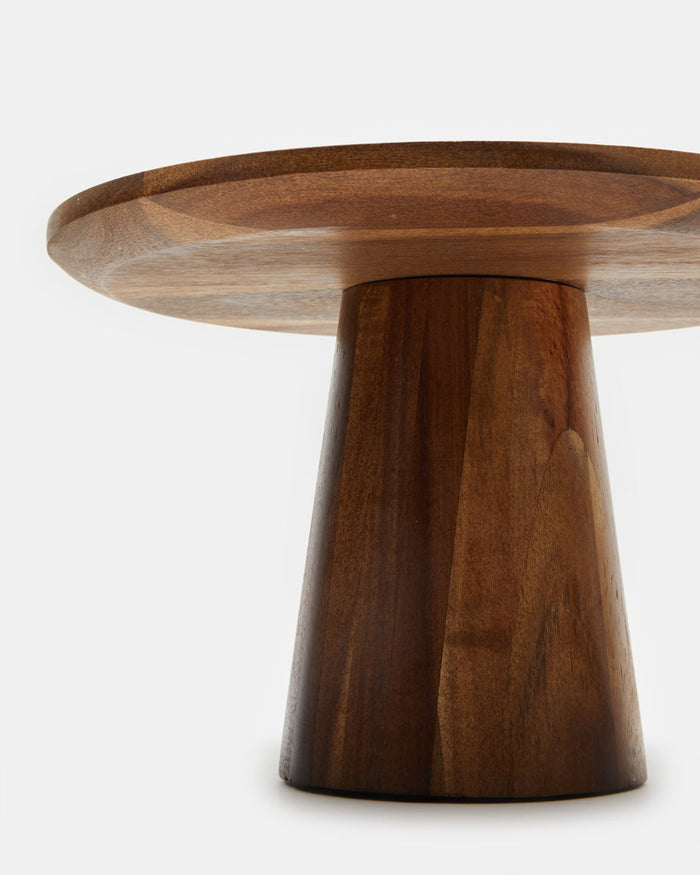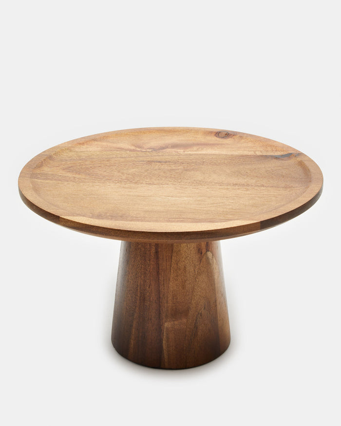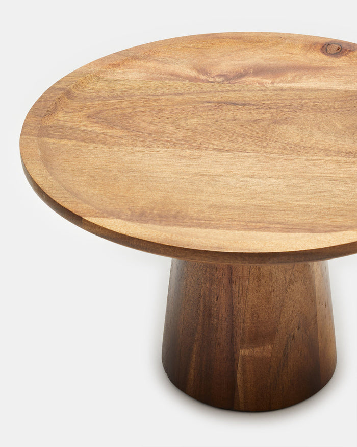 A beautifully crafted wooden cake stand, perfect for displaying and serving cakes with a touch of rustic charm.