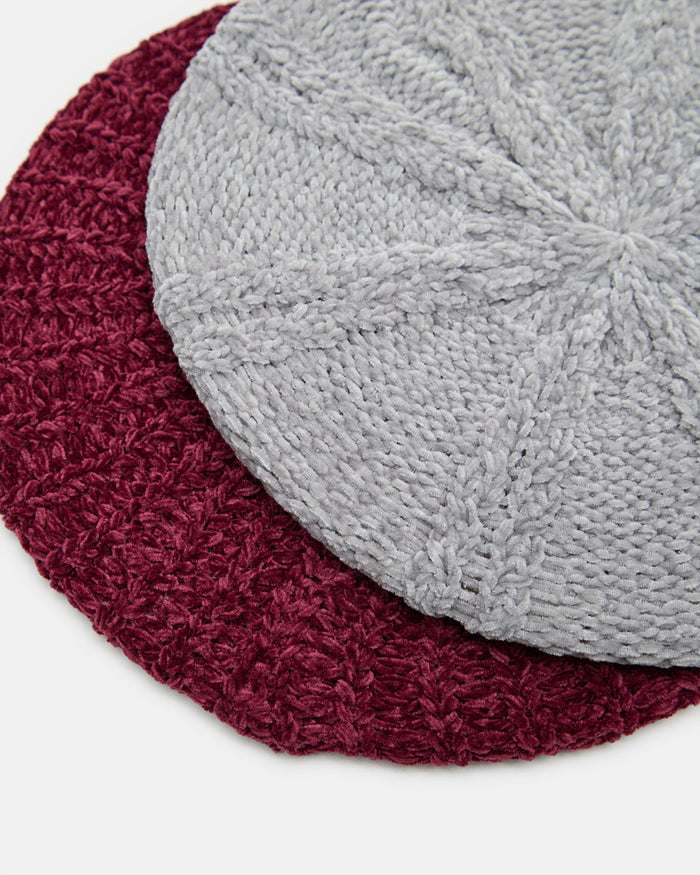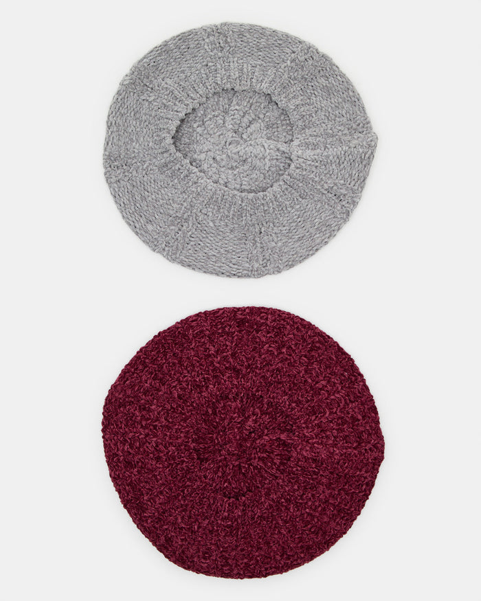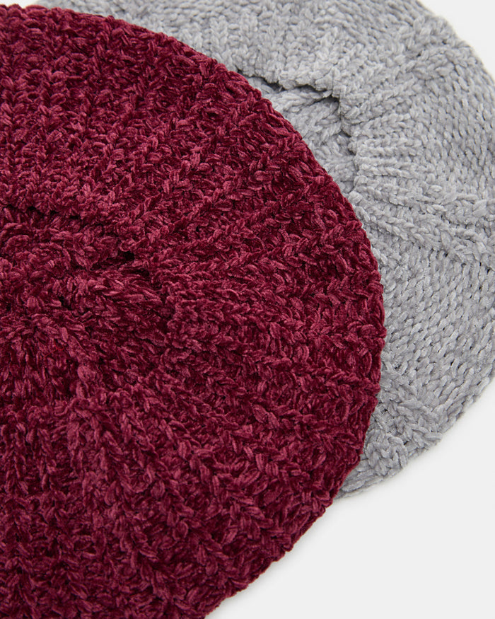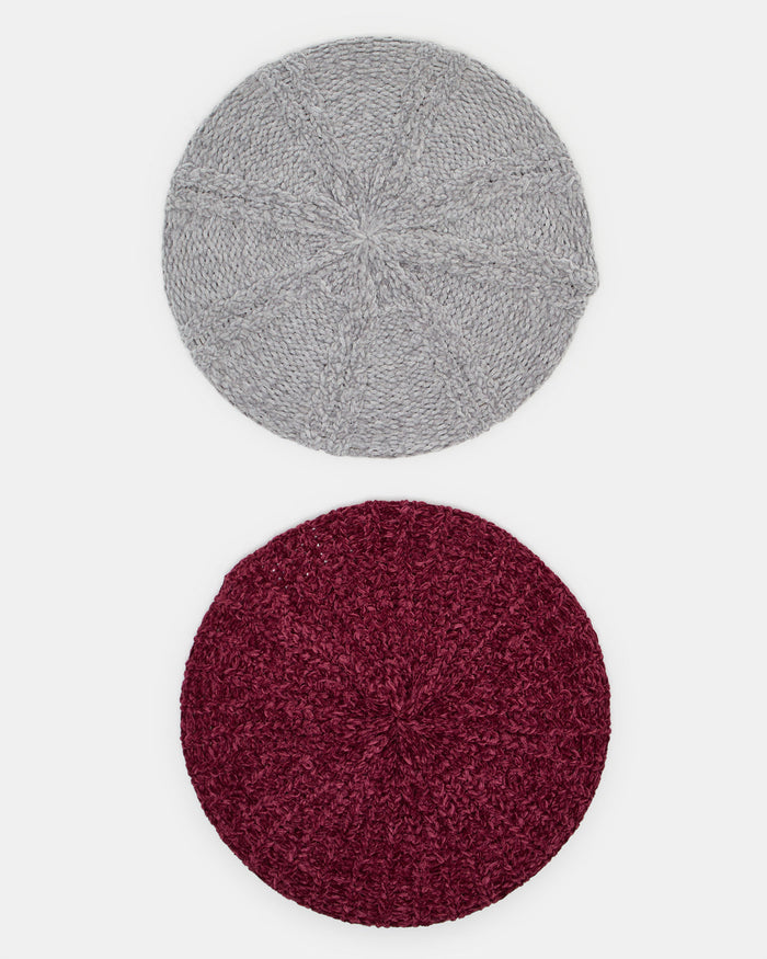 Women Grey And Burgundy Knitted Beret Cap Set (2 Piece)