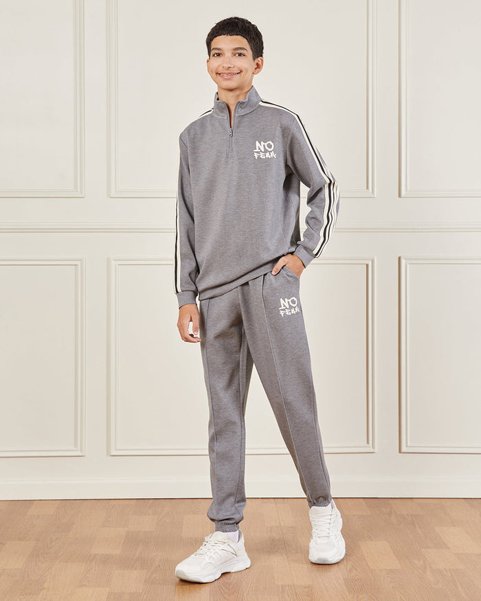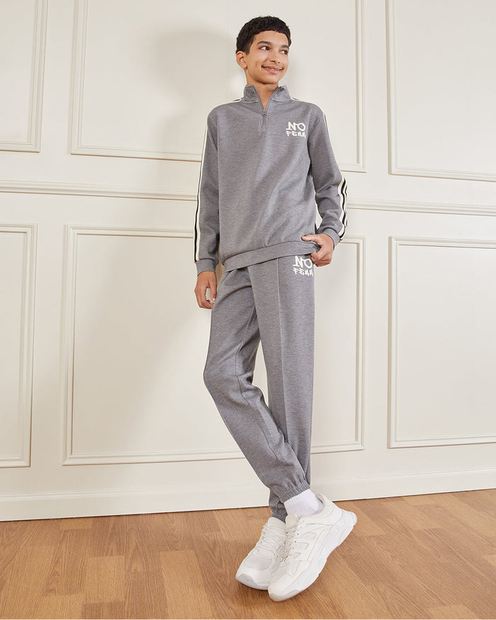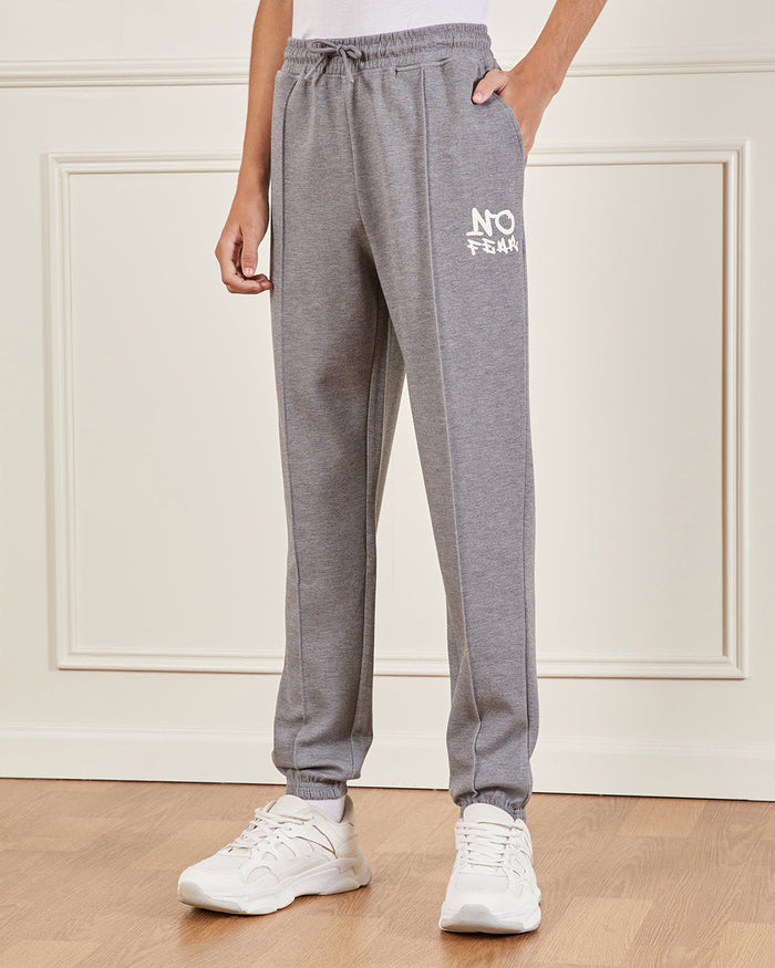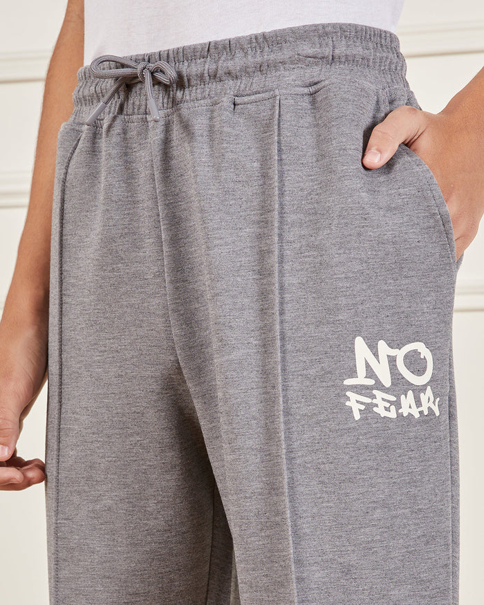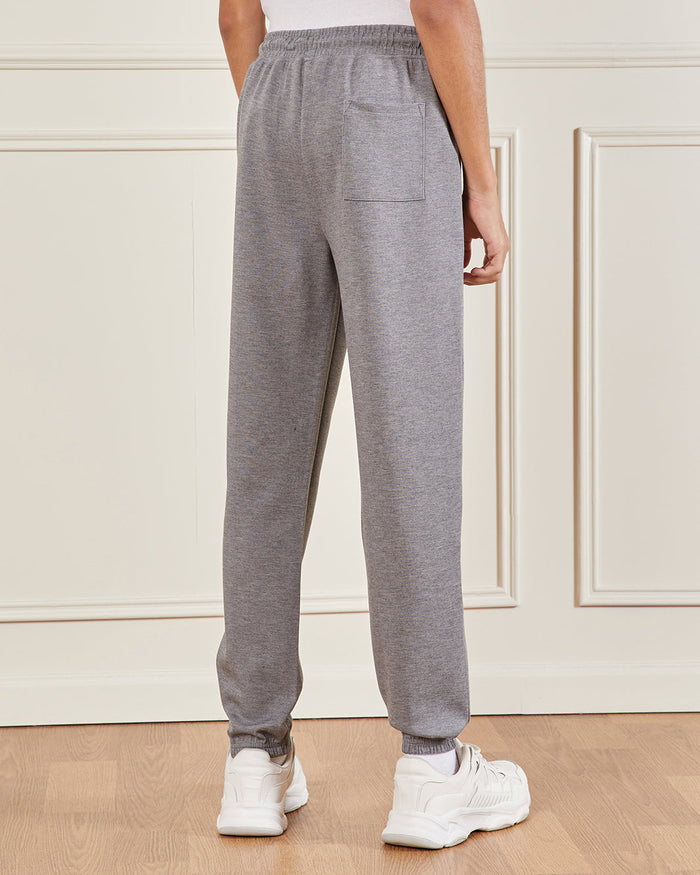 Keep him comfy all day with these classic grey jogger pants for boys. Featuring an elastic waistband, side pockets, and subtle logo detail for a sporty touch. Perfect for lounging, playing, or casual outings.