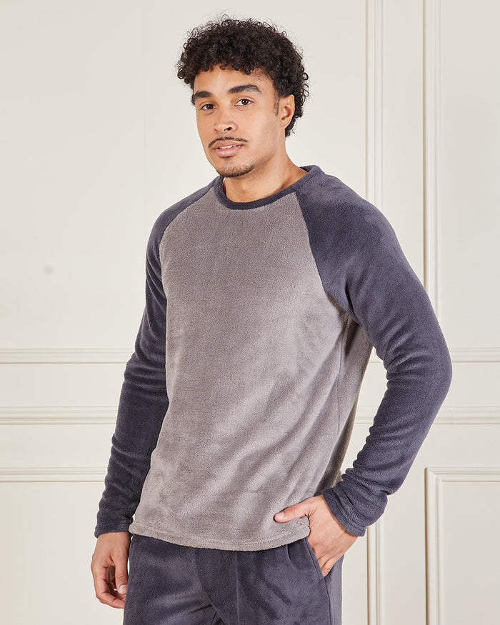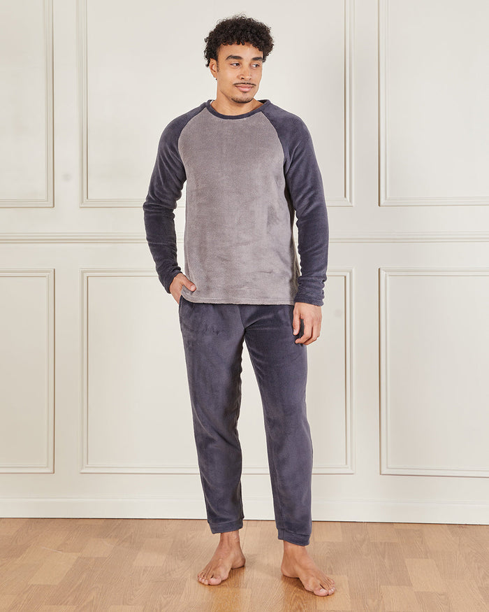 A modern two-tone pyjama set for men in grey and charcoal. Featuring a crew-neck top with contrasting sleeves and matching pants, this item combines comfort with simple elegance.