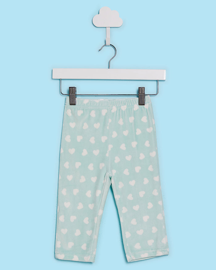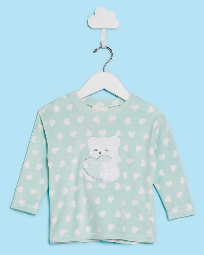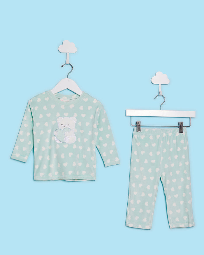 A soft velour pyjama set in a soothing sage tone, featuring an all-over print and sweet appliqué detail on the top. Designed for comfort and cuteness, perfect for bedtime snuggles.