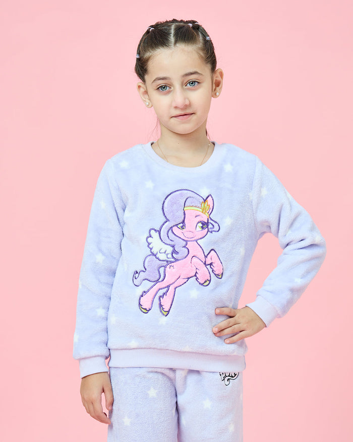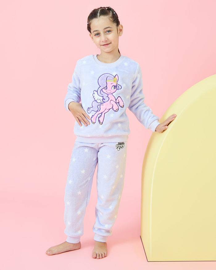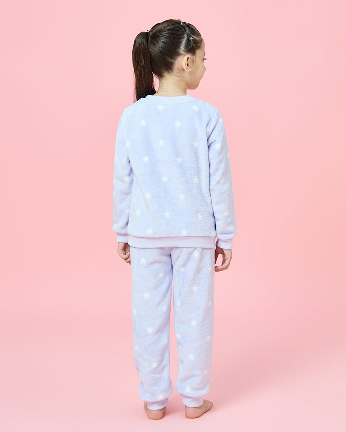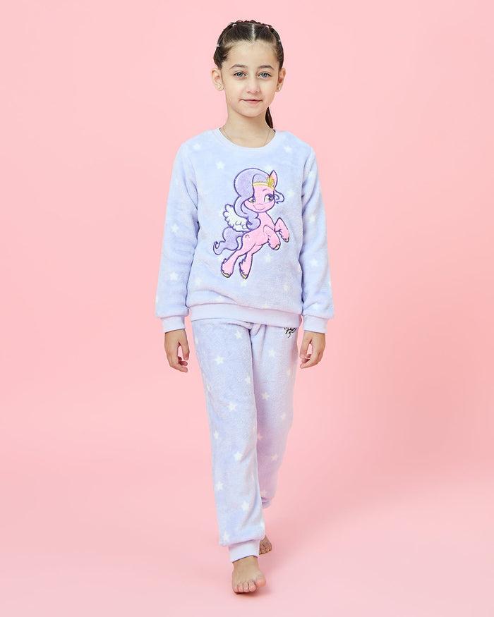Let her drift into dreamland in this cosy lilac fleece pyjama set, adorned with a sweet pony embroidery. Crafted from ultra-soft fabric for warmth and comfort, it’s perfect for snuggly nights. The matching top and pants make bedtime her favourite time of the day.