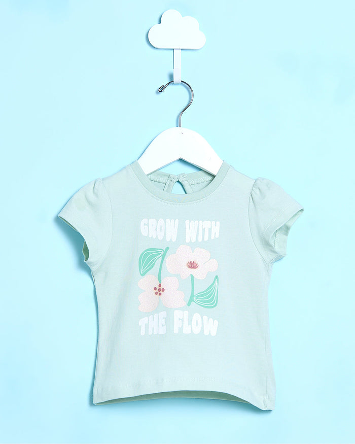 A soft mint green T-shirt featuring a cute floral print and positive “Grow With The Flow” slogan, perfect for cheerful everyday wear.