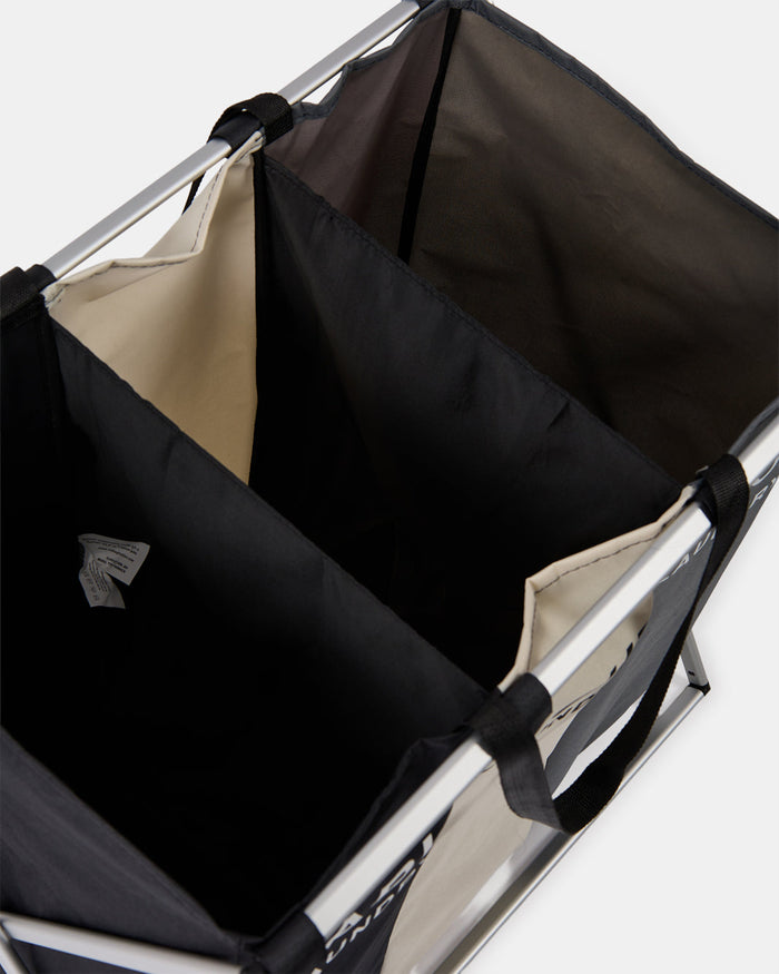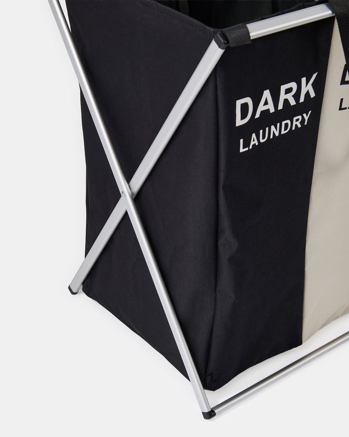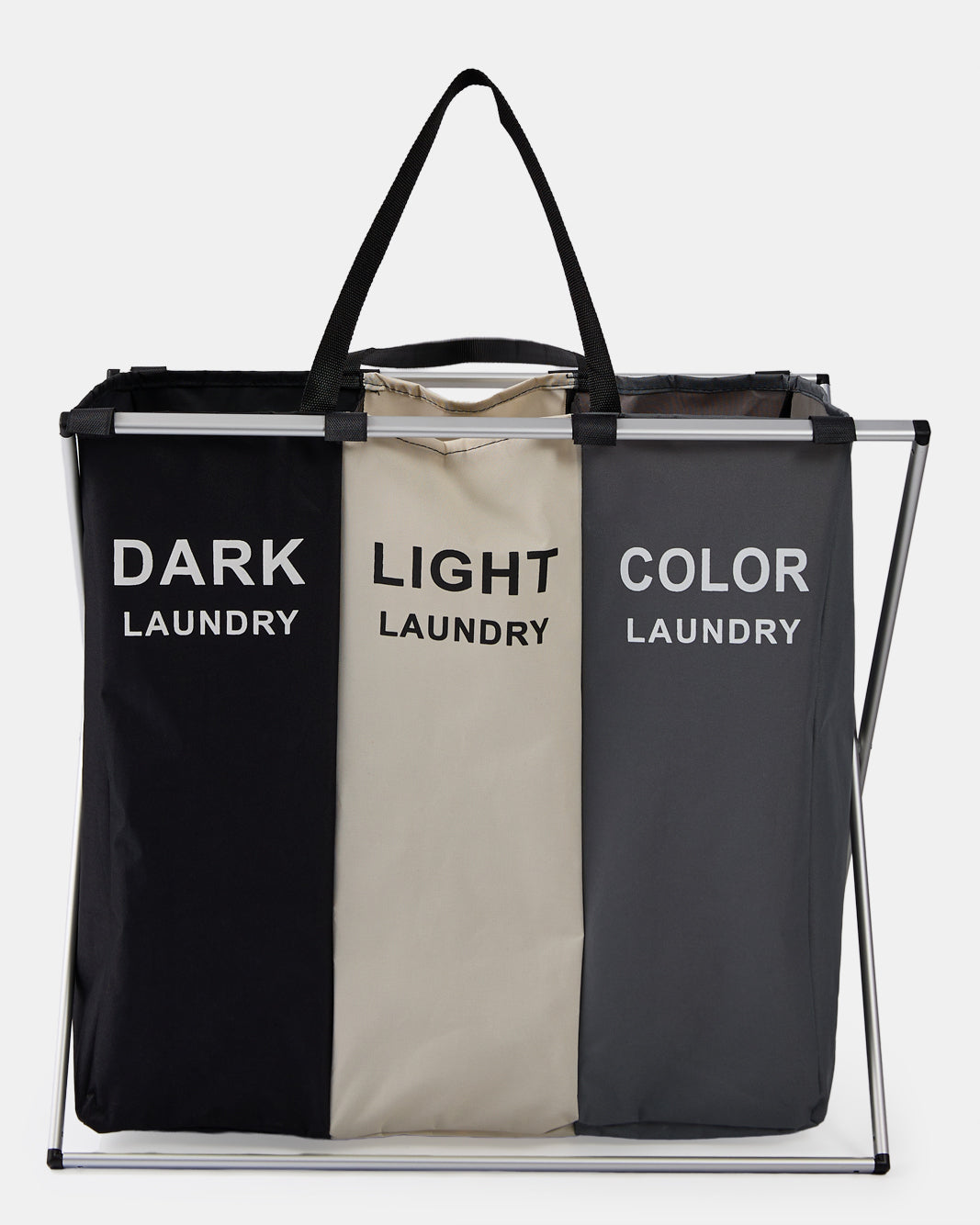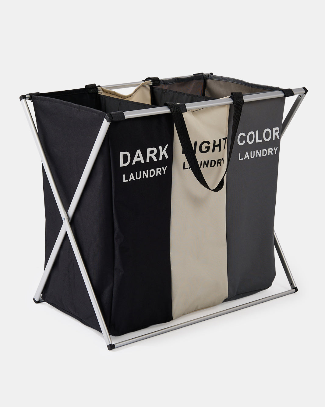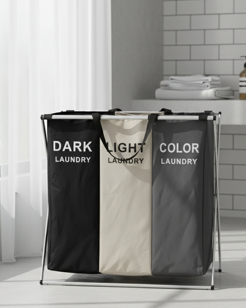 A 3-Section laundry sorter with a sturdy metal frame and labelled fabric compartments for dark, Light, and Colour laundry. Convenient handles make carrying easy and organised.
