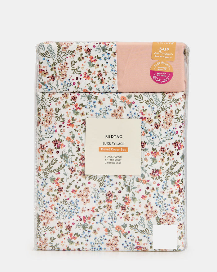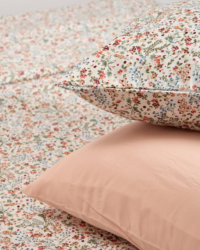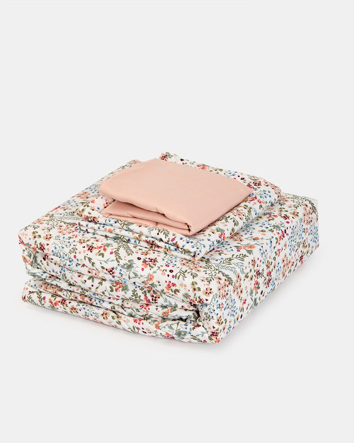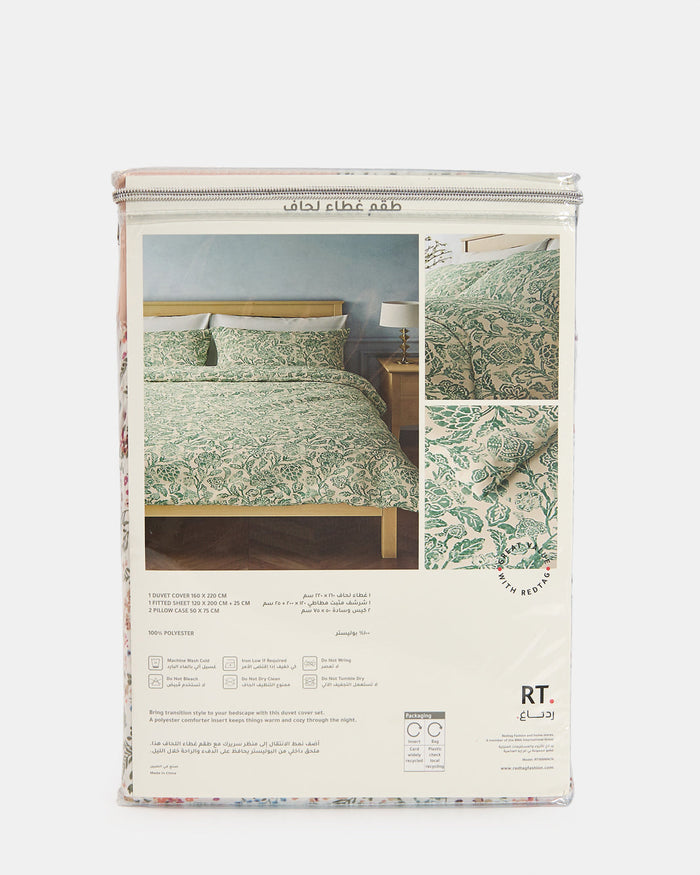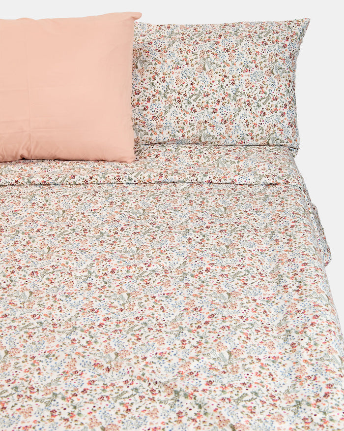 Bring a touch of charm to your bedroom with this floral duvet cover set. Featuring a delicate all-over print in soft pastel tones, it adds freshness and warmth to your space. Made for everyday comfort, this set includes a duvet cover, a fitted sheet, and two pillowcases, offering a complete and coordinated look.