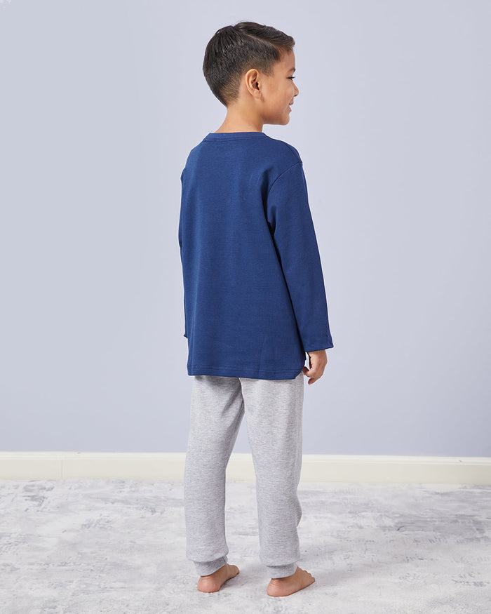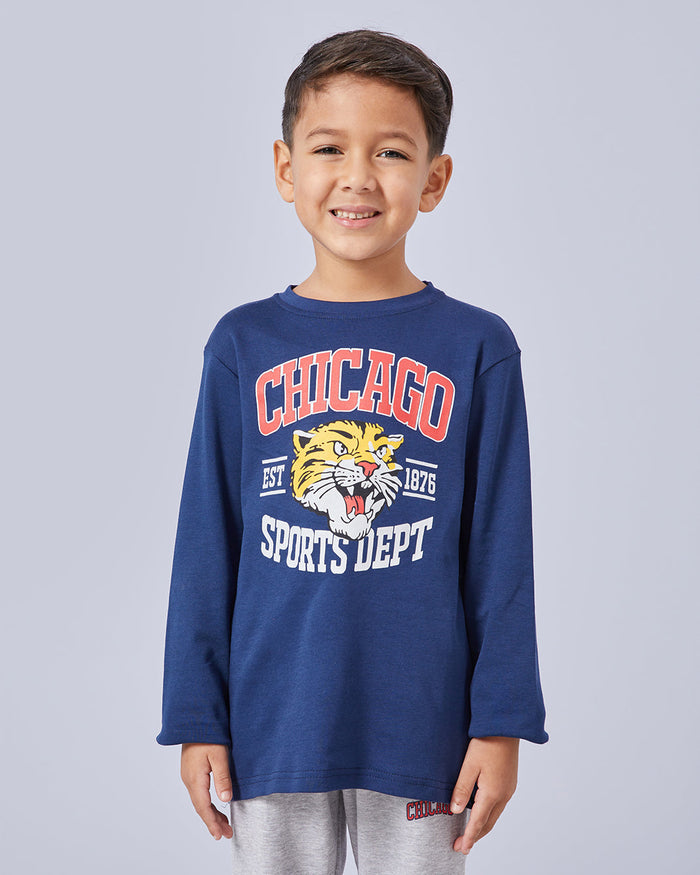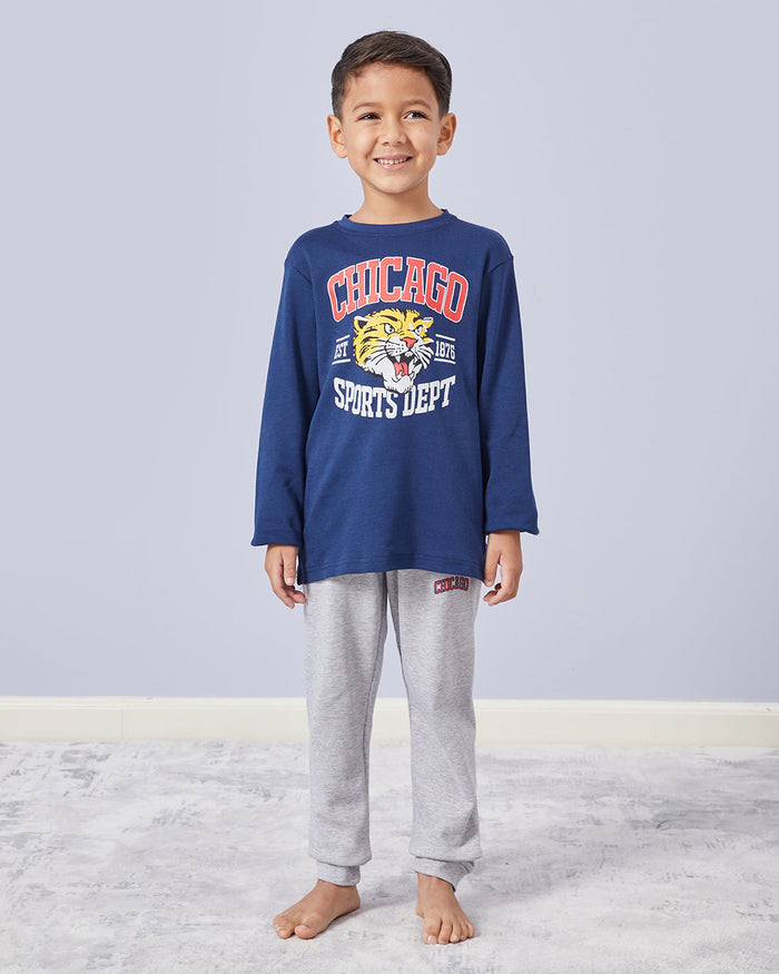 Perfect for young sports fans, this pyjama set includes a navy top with a tiger and “Chicago Sports Dept” print. The soft grey pants complete the sporty look, ensuring comfort through the night.