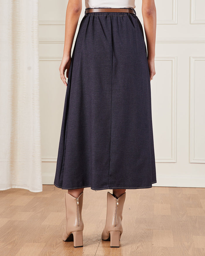 An effortlessly elegant choice, this navy woven midi skirt features a structured flared silhouette and comes with a detachable belt to accentuate your waistline. Perfect for smart-casual styling or workwear updates.