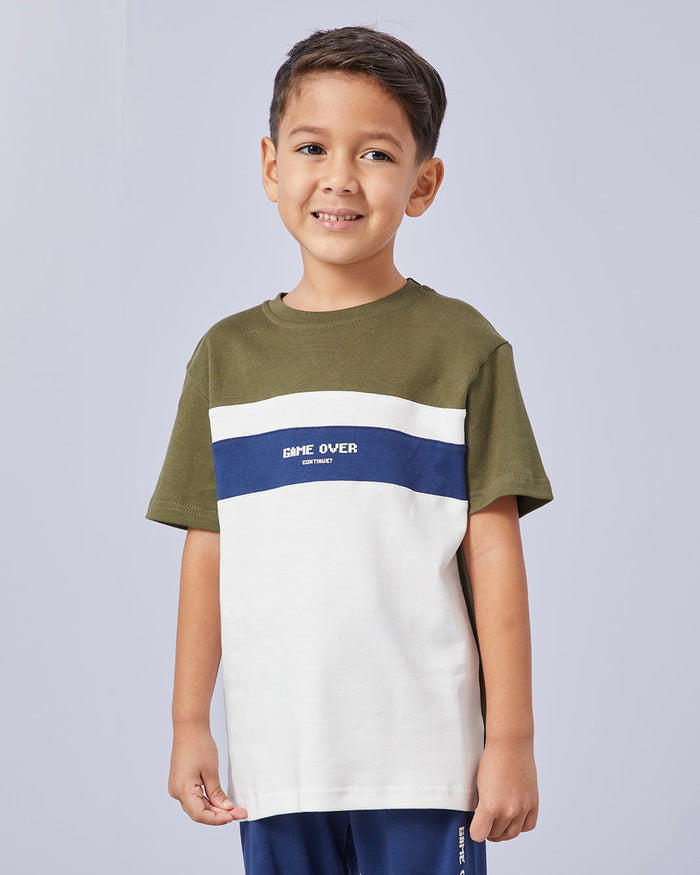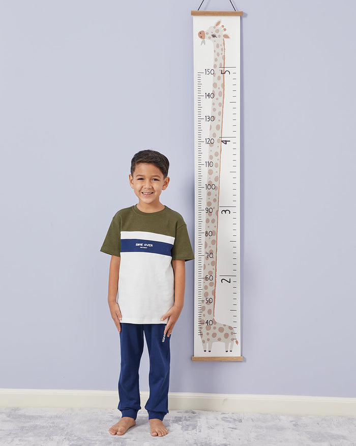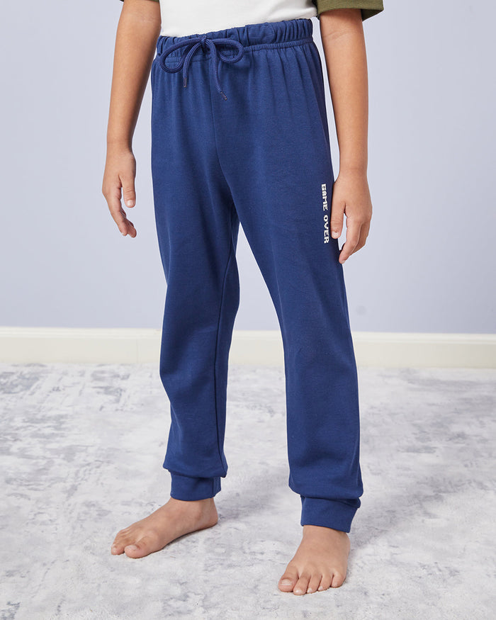 A soft and comfy pyjama set designed for boys who love sporty style. The top features a round neck and short sleeves, paired with solid pants for a cool bedtime look.