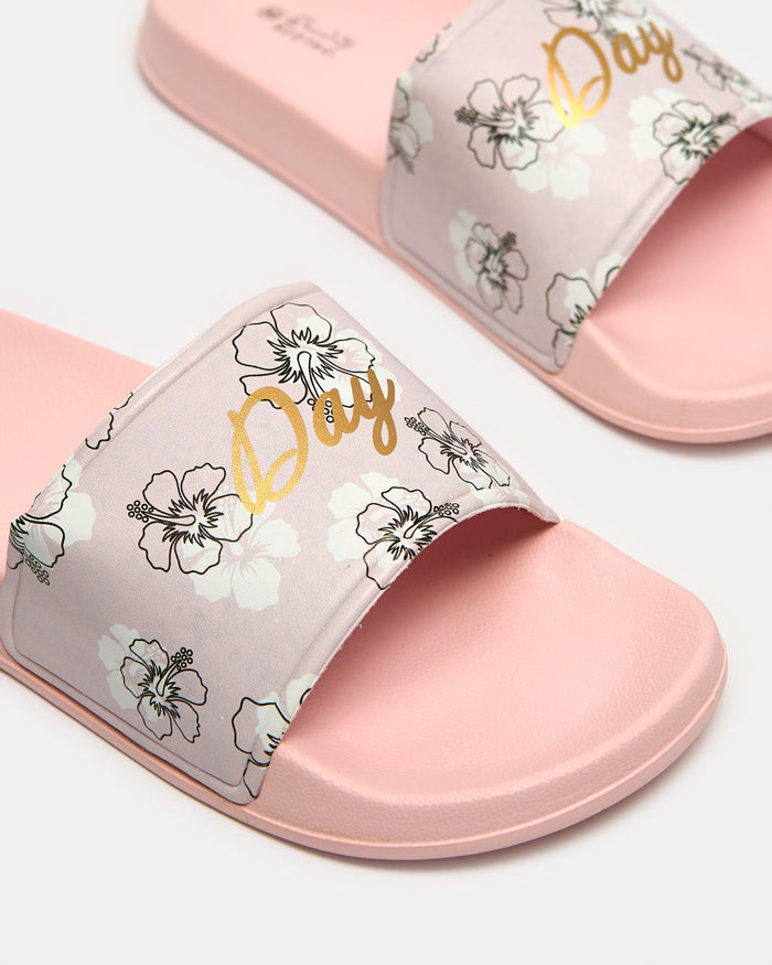 Pink slide slippers with a fun printed strap and soft footbed—feminine, comfy, and perfect for relaxed days at home or poolside.