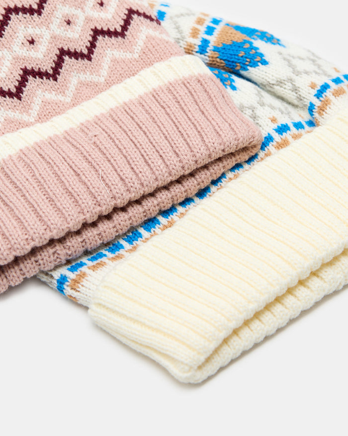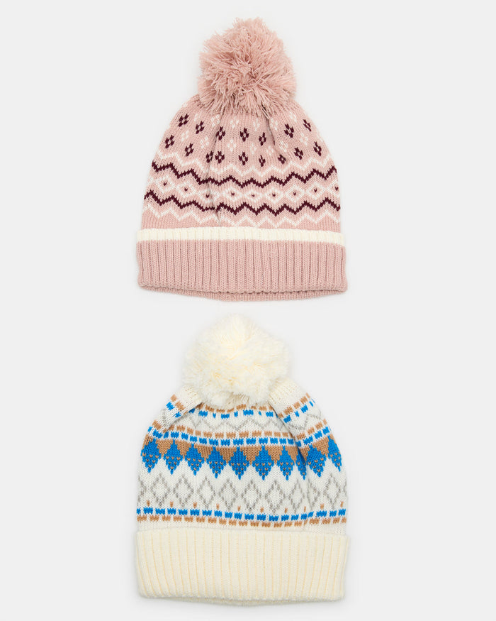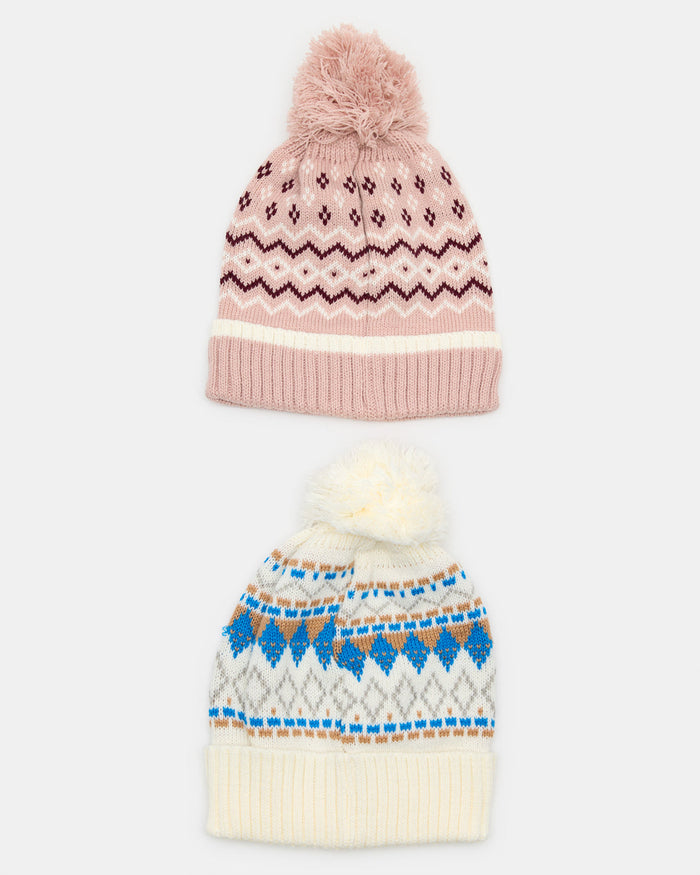 Women Pink And Cream Knitted Cap Set (2 Piece)