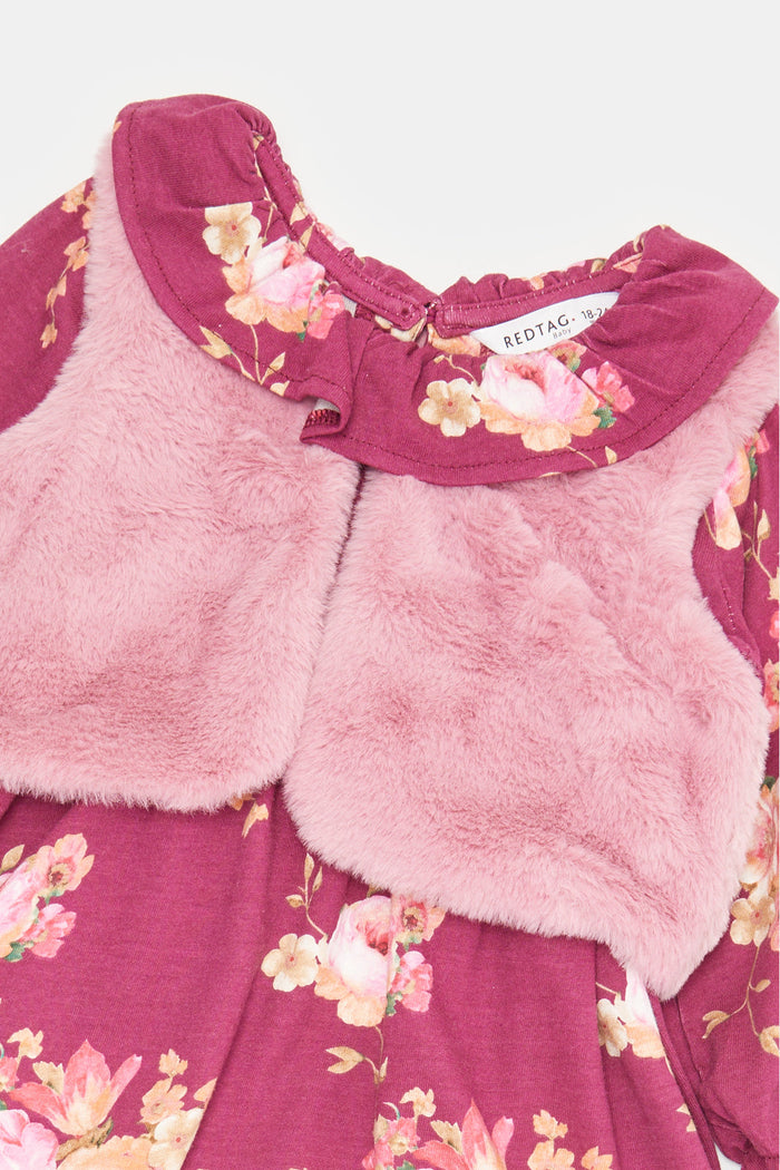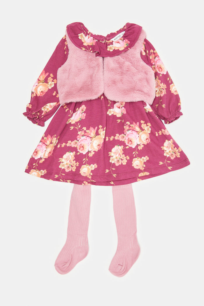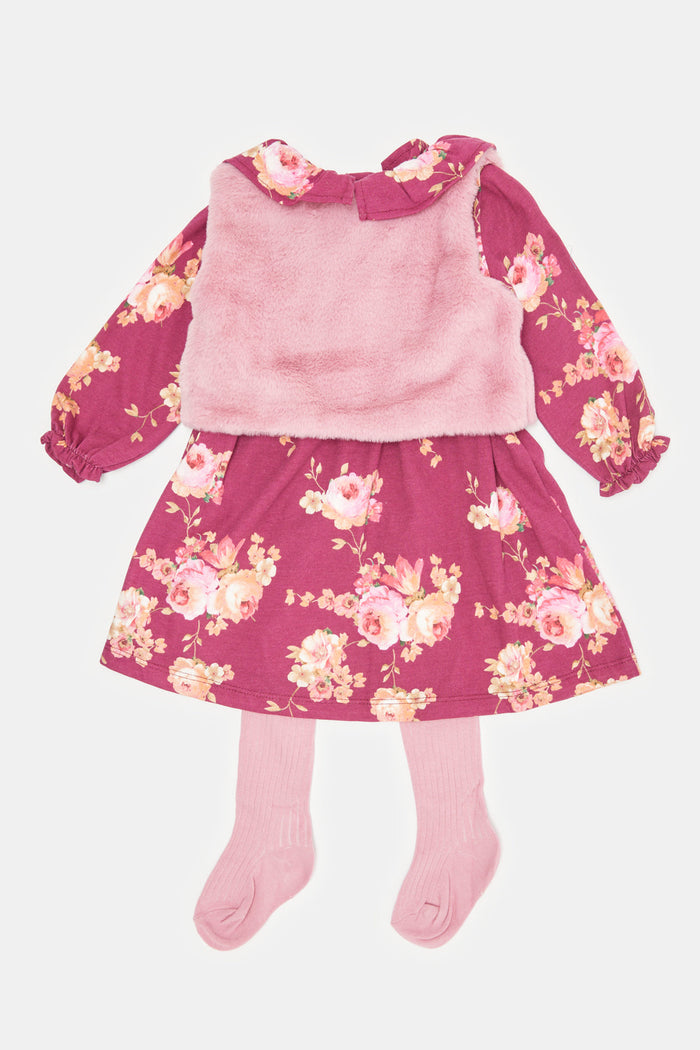 Infant Girls Purple And Pink Printed Dress Set With Tights (3 Piece)