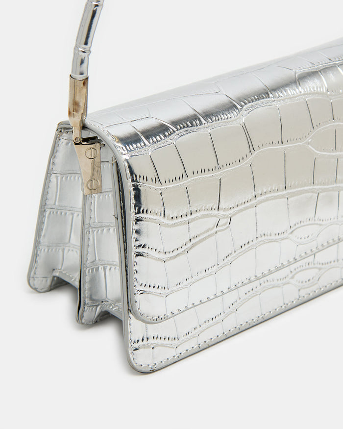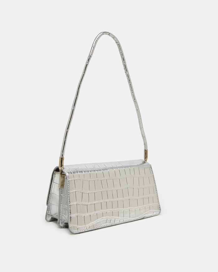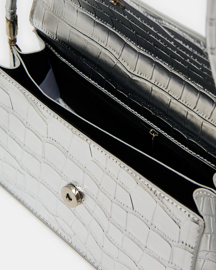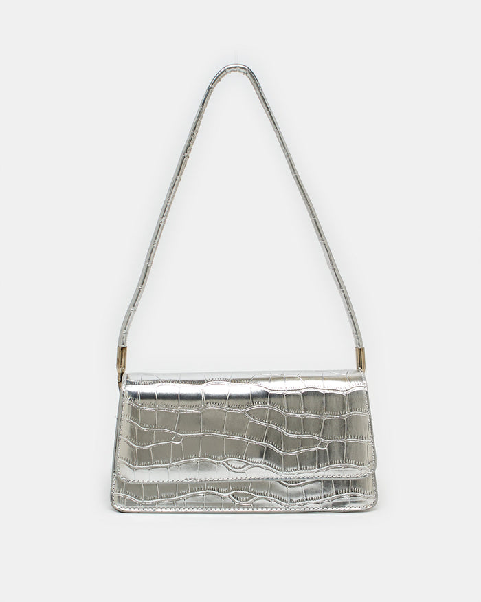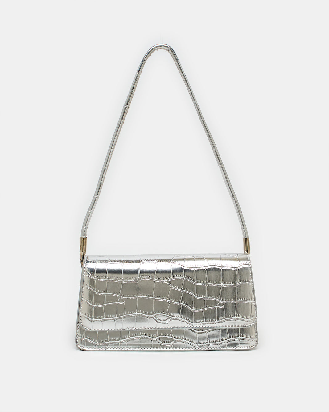 This silver croc-effect shoulder bag brings a statement shine to any look. Its sleek rectangular shape and compact size make it perfect for evening wear or special occasions. Designed with a magnetic snap closure, it ensures both style and convenience.