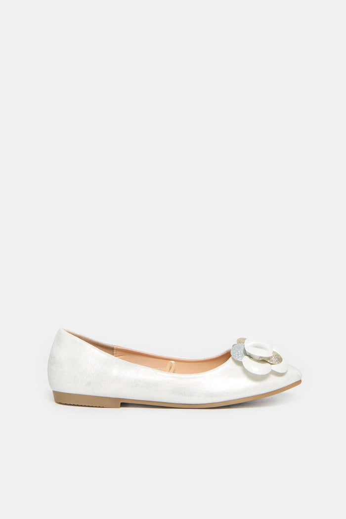 A silver pair of ballerinas with embellishments for senior girls. This pair is perfect to match with a dress on different occasions.