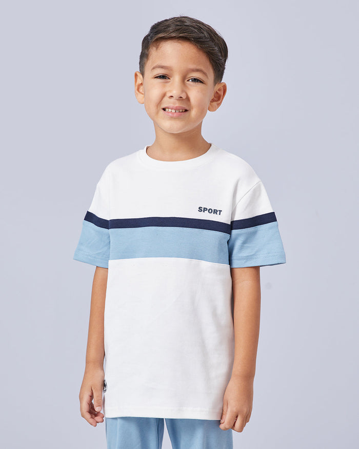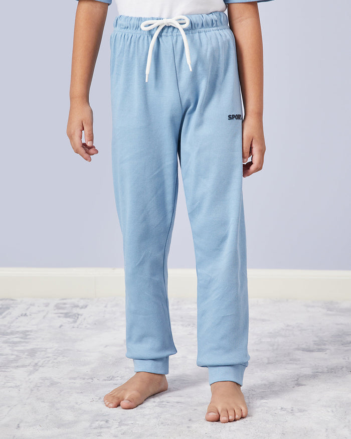A soft and comfy pyjama set designed for boys who love sporty style. The top features a round neck and short sleeves, paired with solid pants for a cool bedtime look.