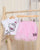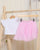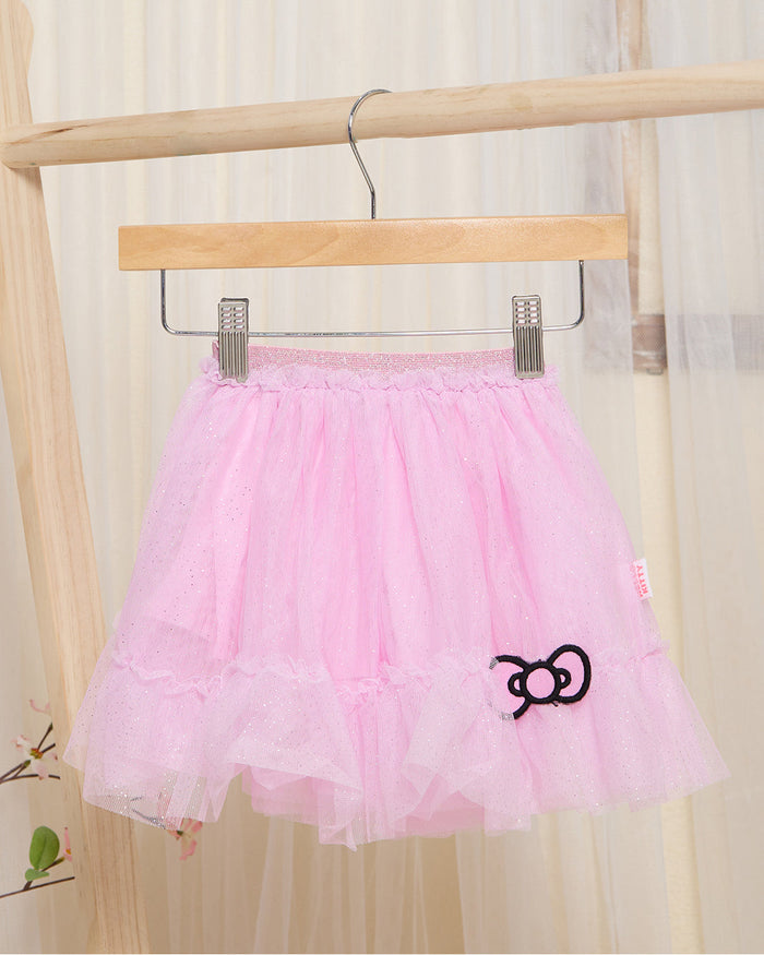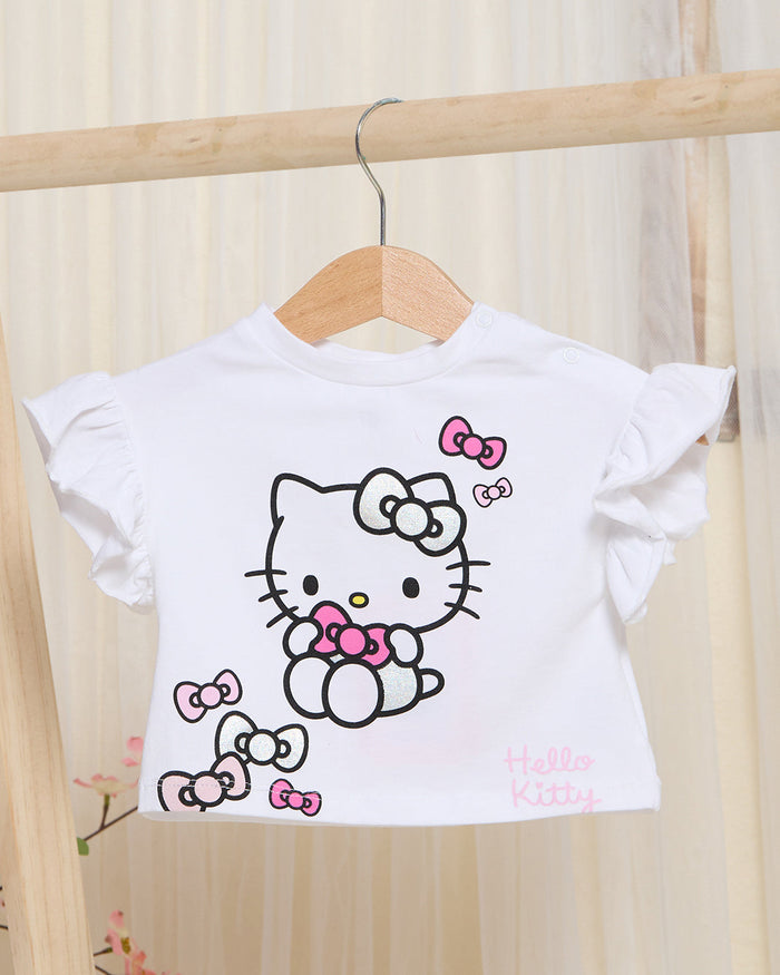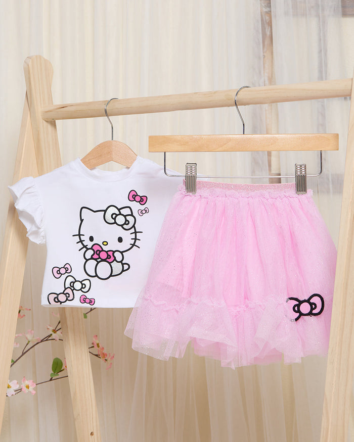 A cute and stylish outfit featuring a soft white T-shirt with an adorable Hello Kitty design, paired with a pink skirt for a charming look. Made from comfortable, breathable fabric, perfect for everyday wear or special outings.